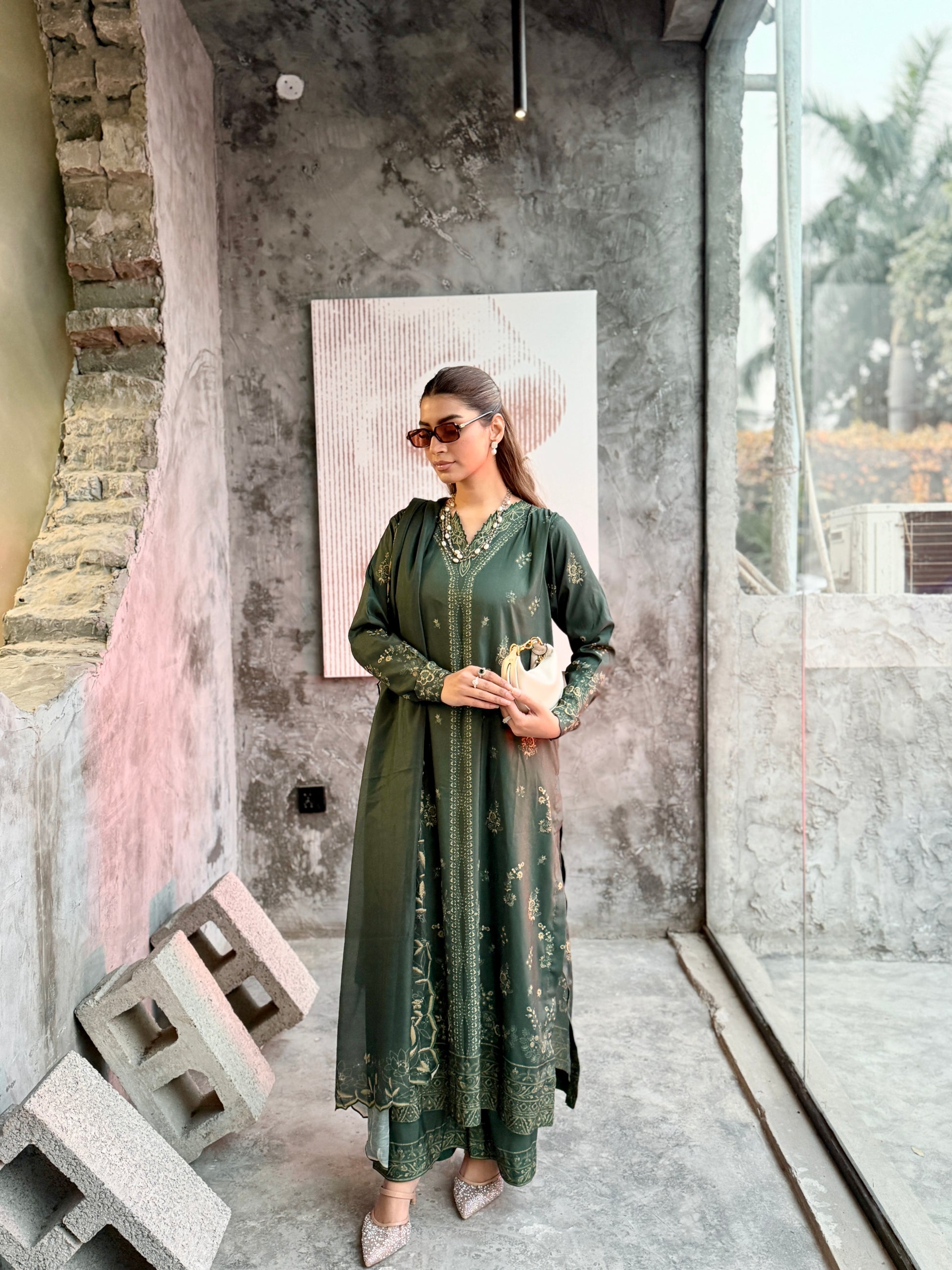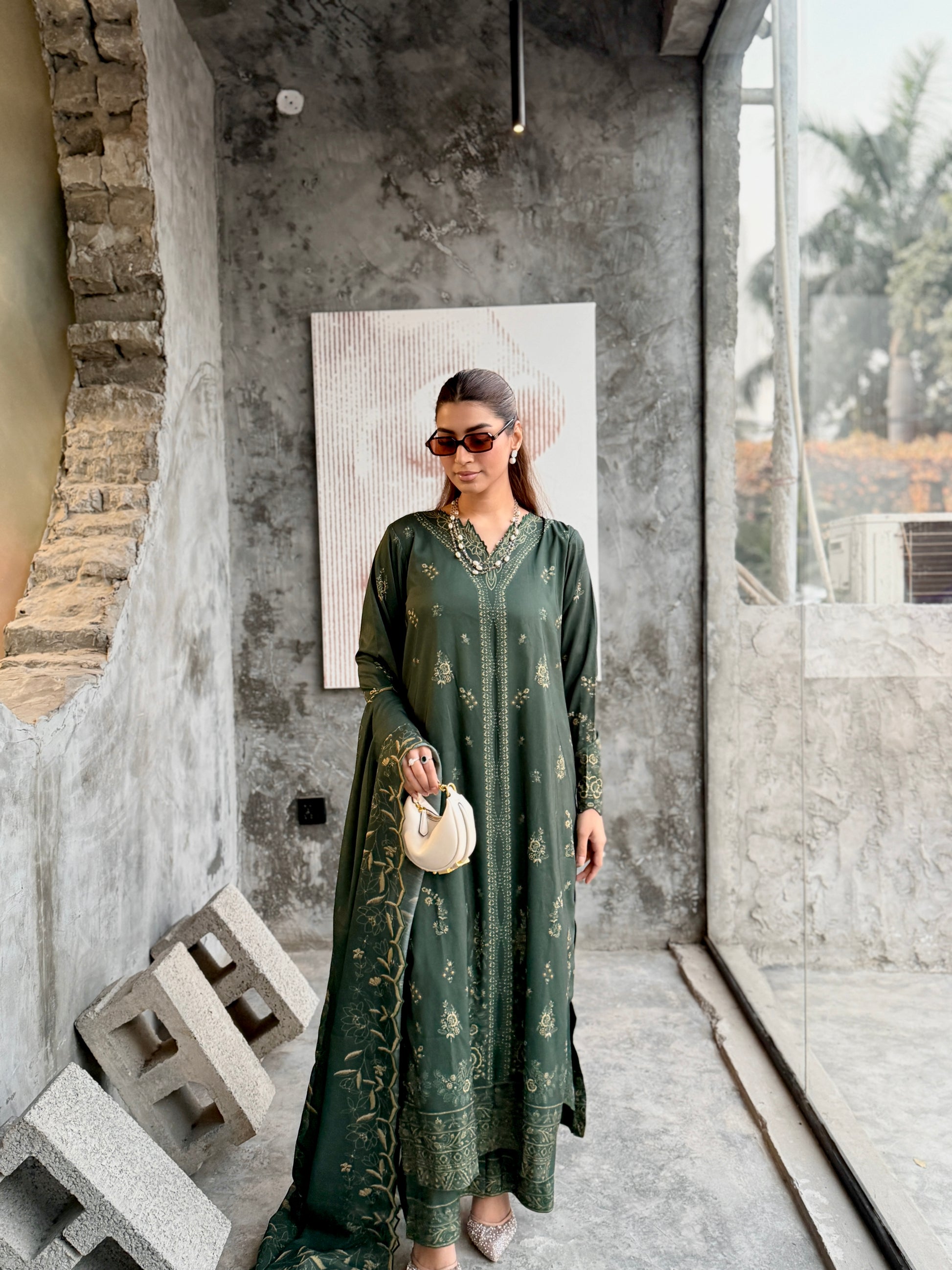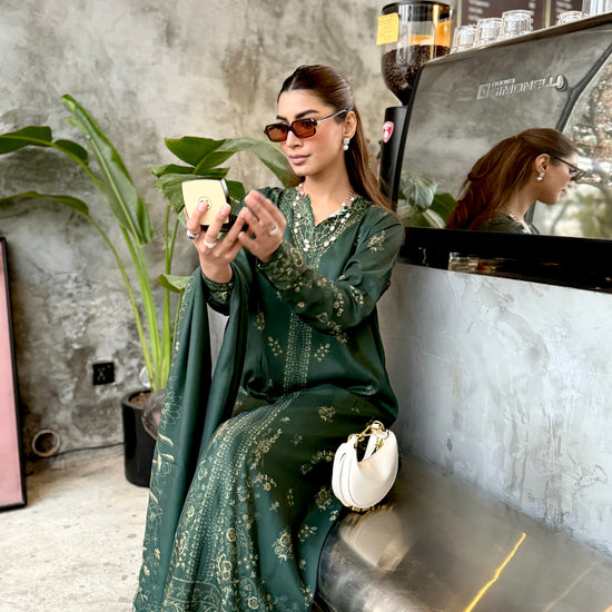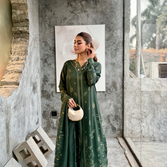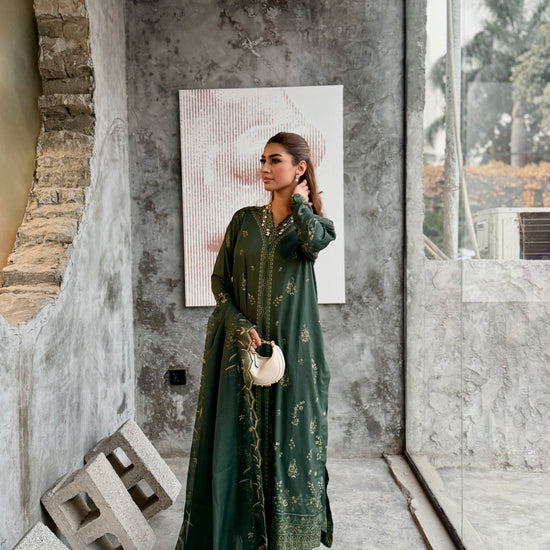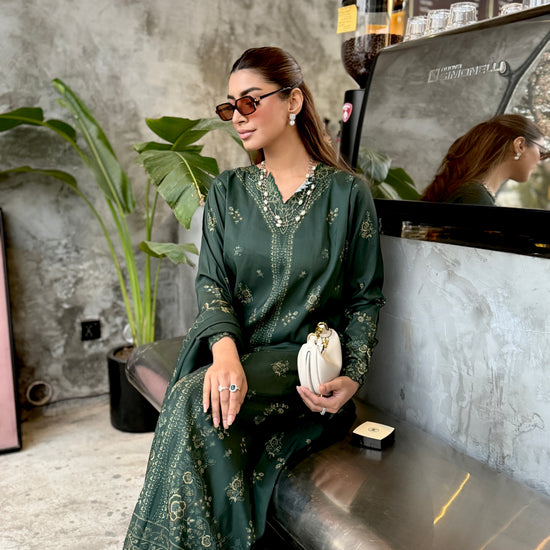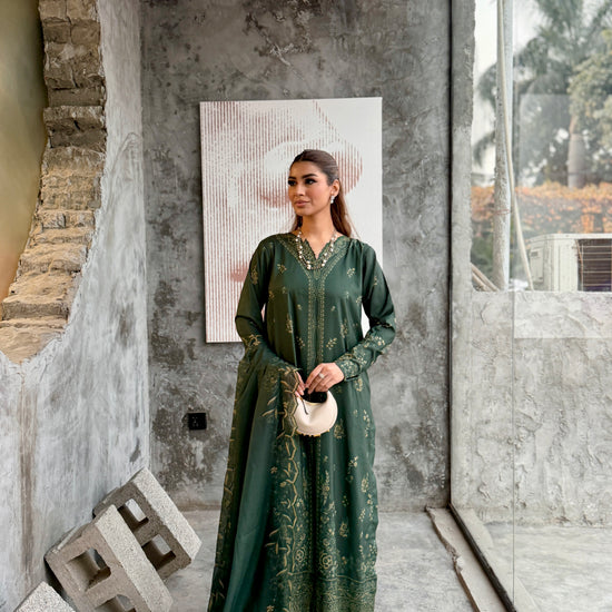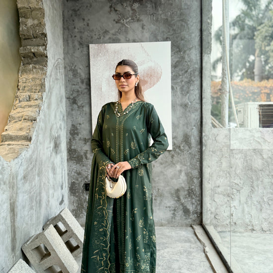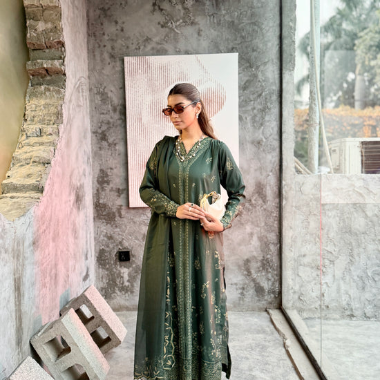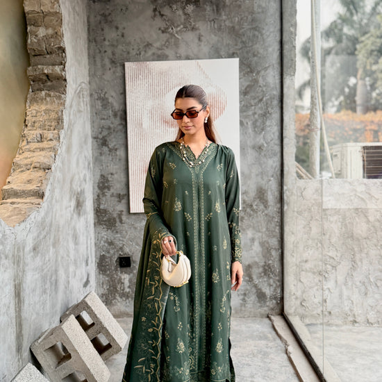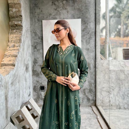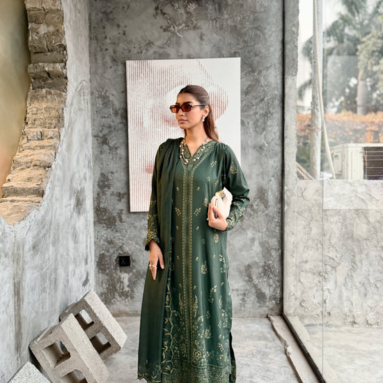 The outfit features a dark green colour scheme with intricate embroidery on the neckline of the long shirt, which has fitted sleeves. Paired with a same-colour loose trouser and dupatta, the latter boasts embroidered borders, adding a touch of sophistication to the ensemble.
