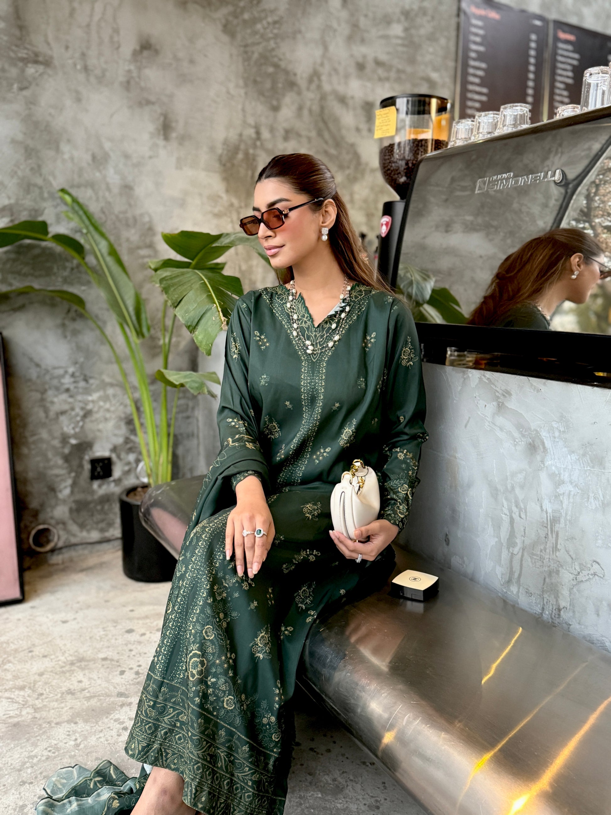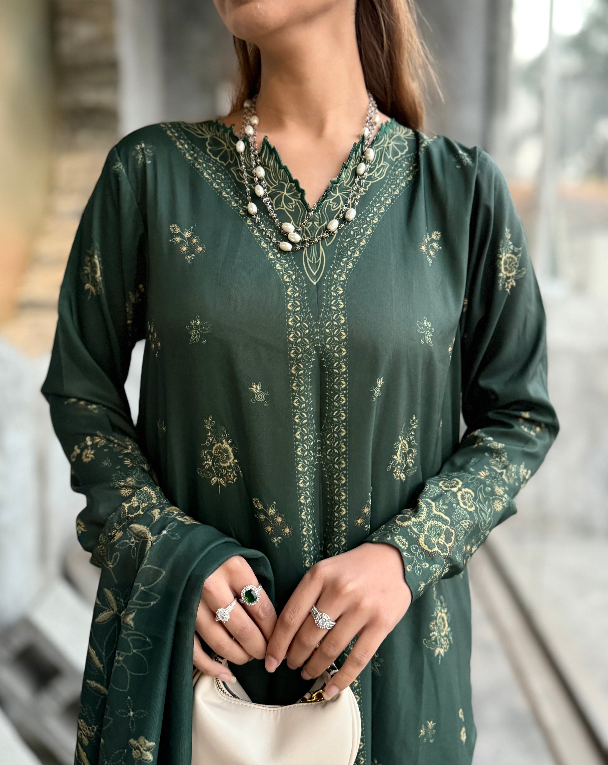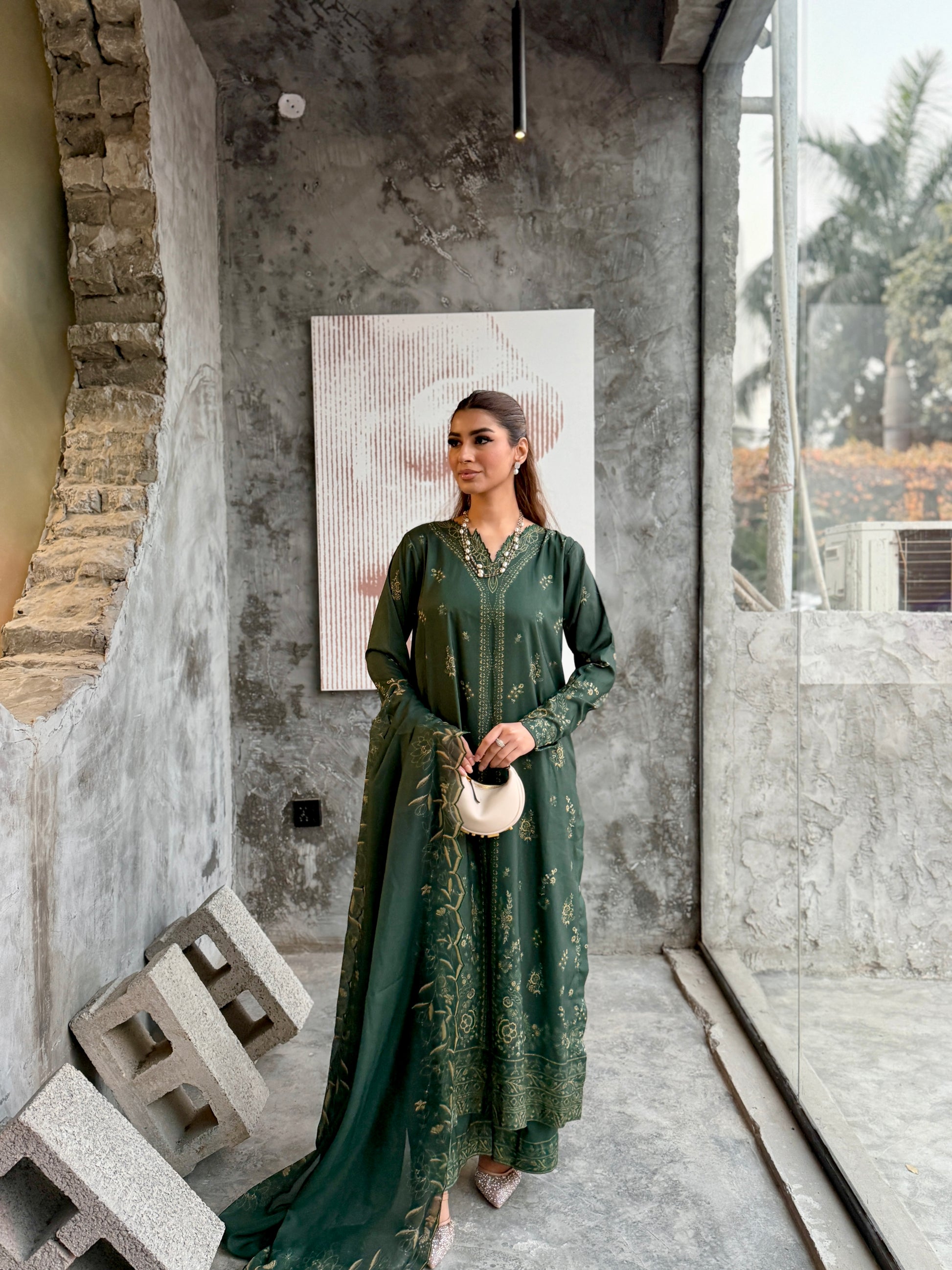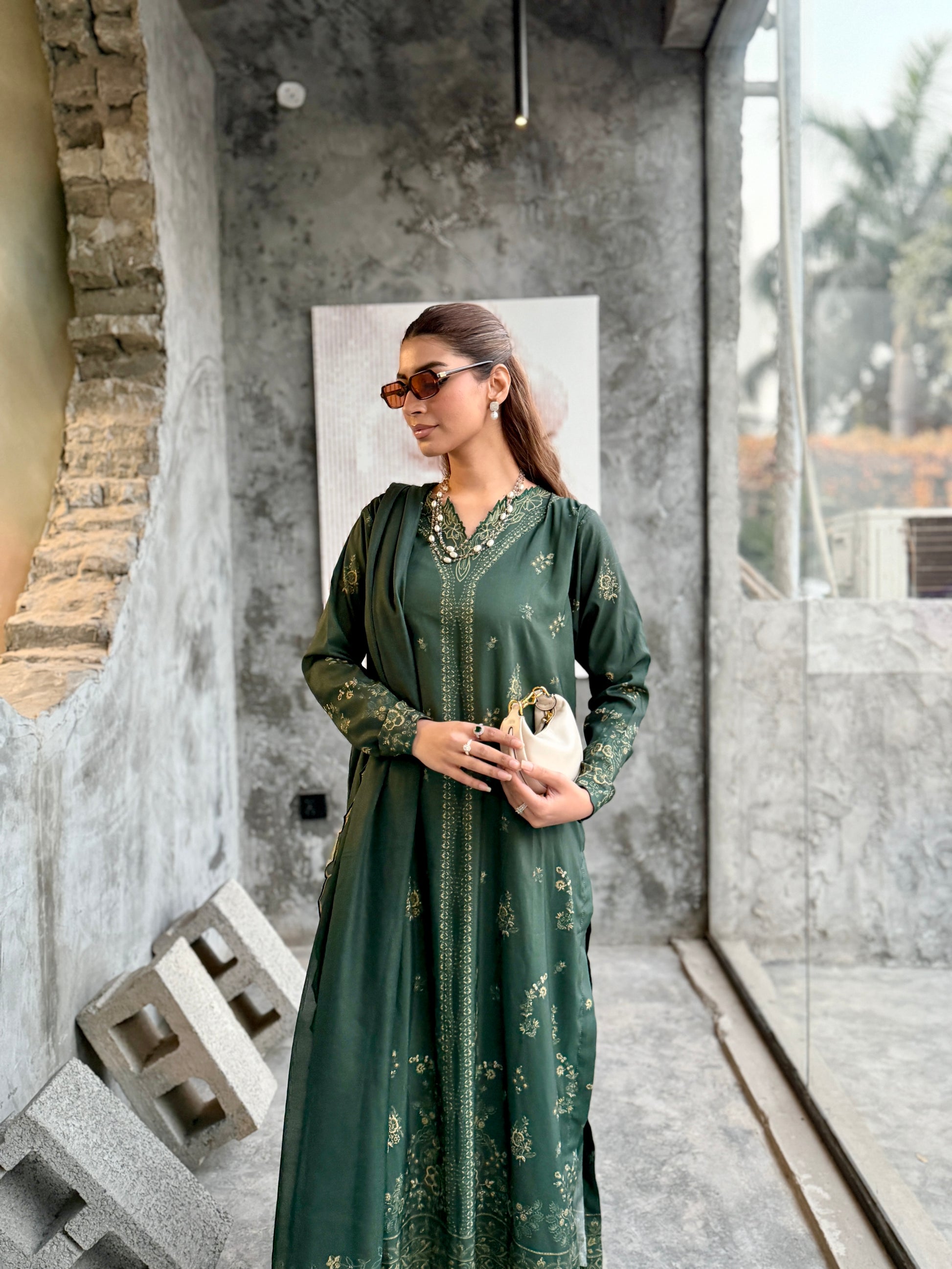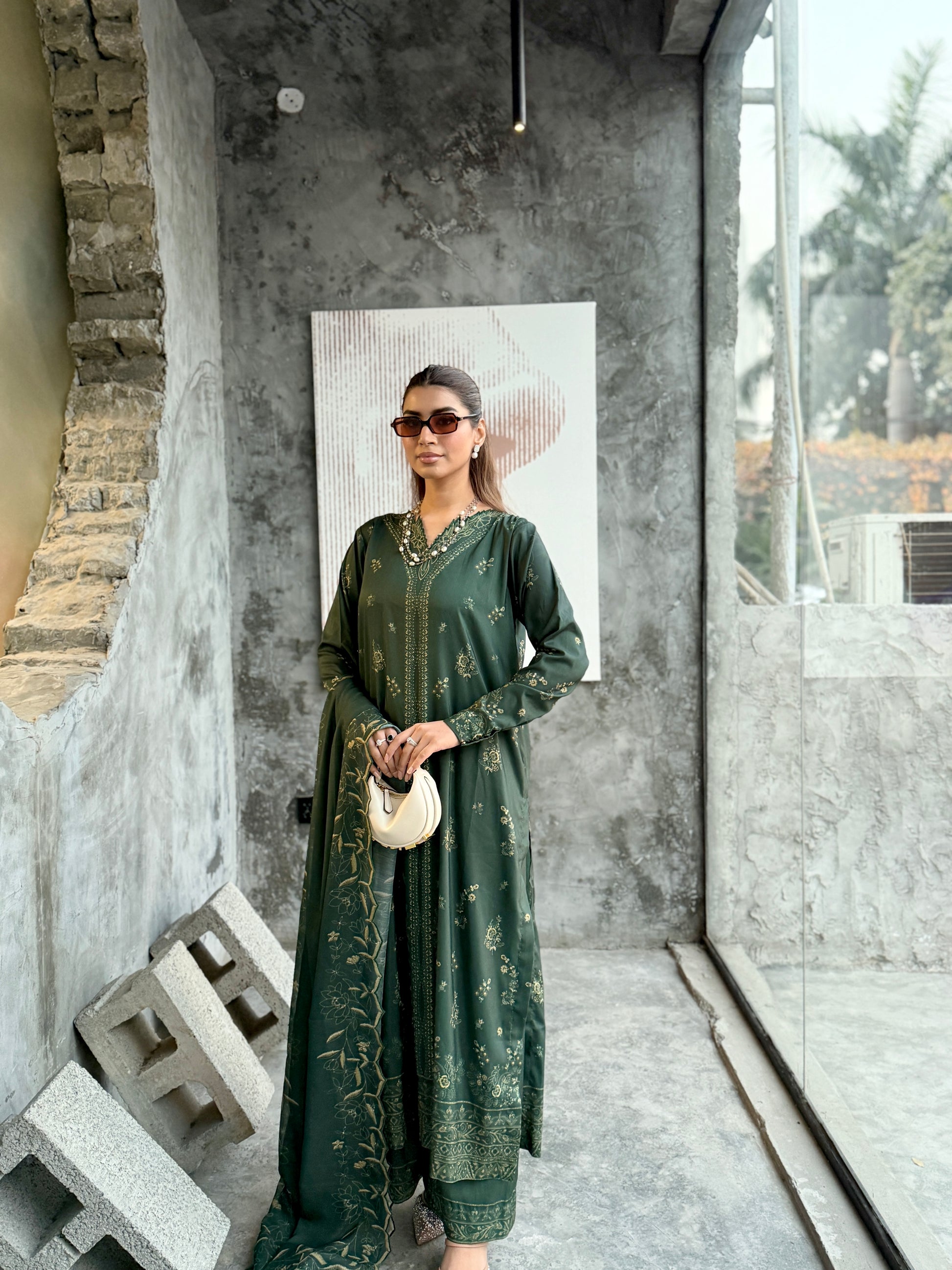 The outfit features a dark green colour scheme with intricate embroidery on the neckline of the long shirt, which has fitted sleeves. Paired with a same-colour loose trouser and dupatta, the latter boasts embroidered borders, adding a touch of sophistication to the ensemble.