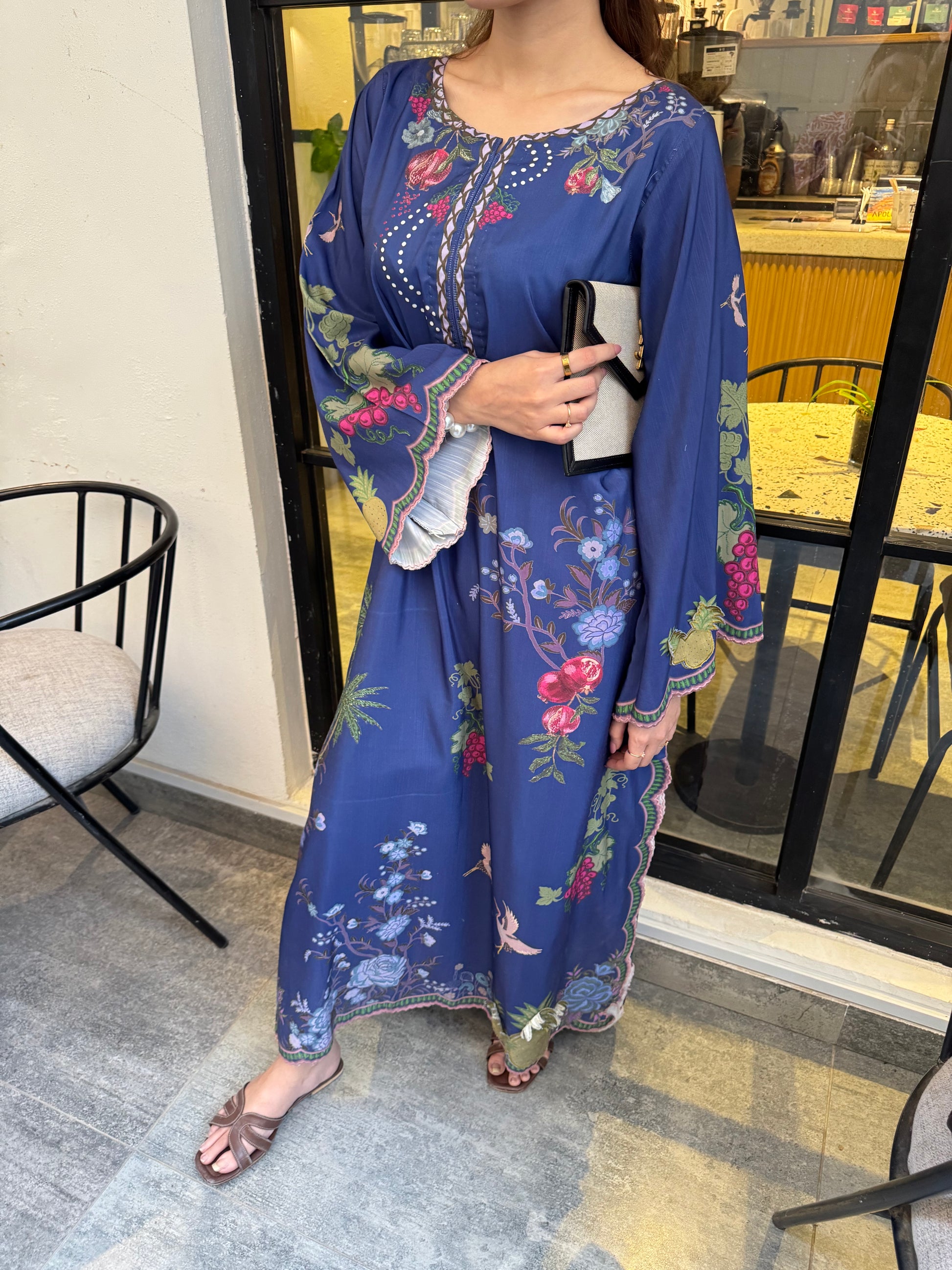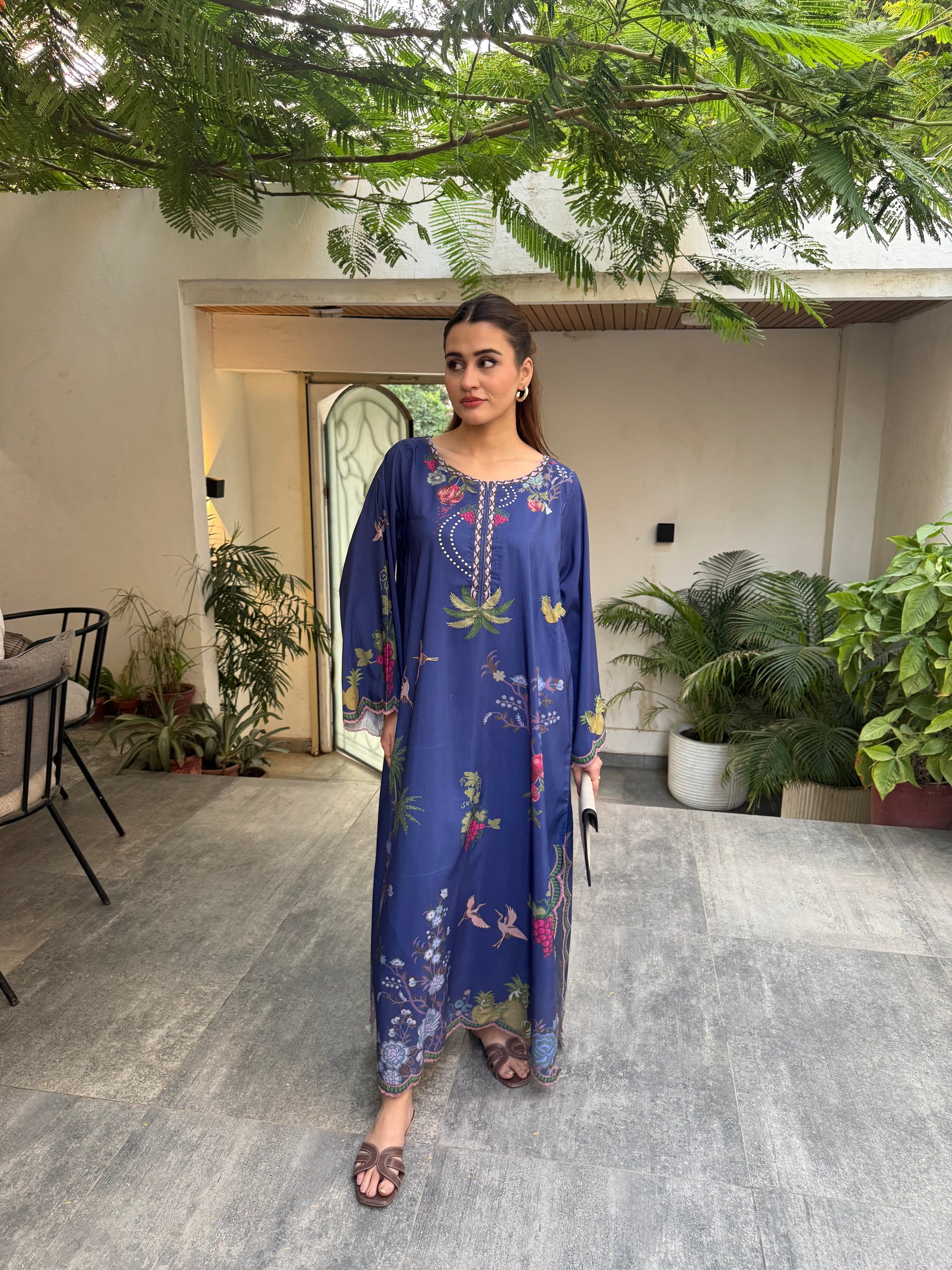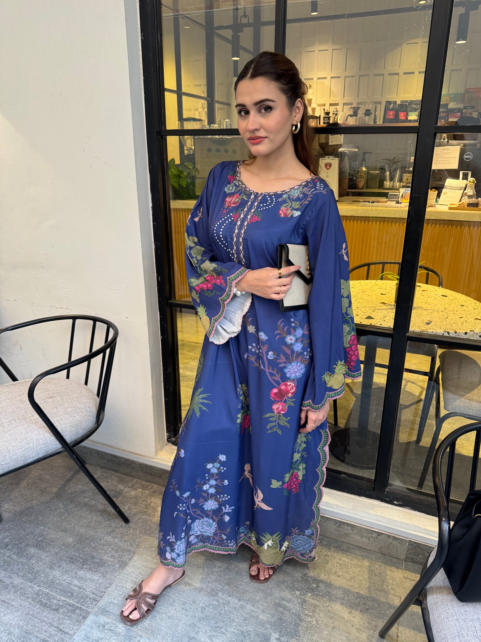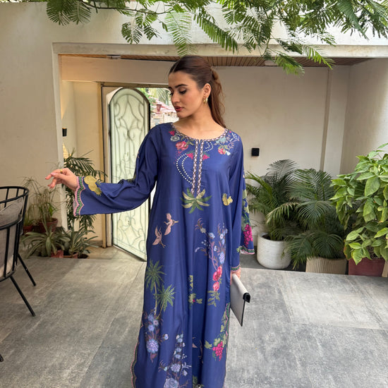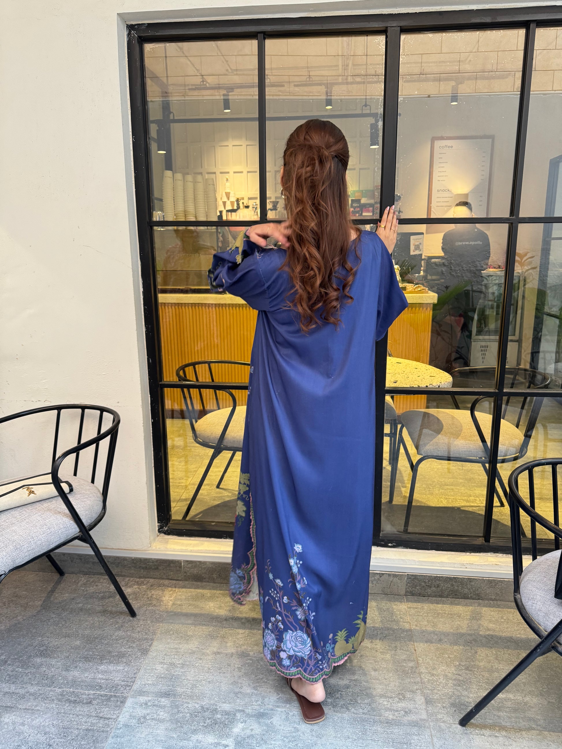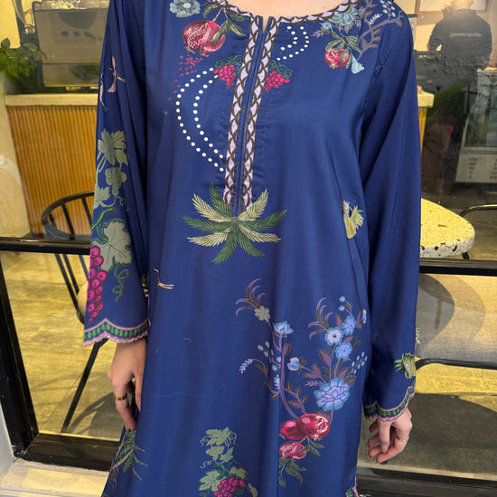 Blue kaftaan made on woolen raw silk boasting 3d pineapple motifs and scallop details on the Chaak, Daman, and sleeves.check the size chart in the pictures to find your perfect size.