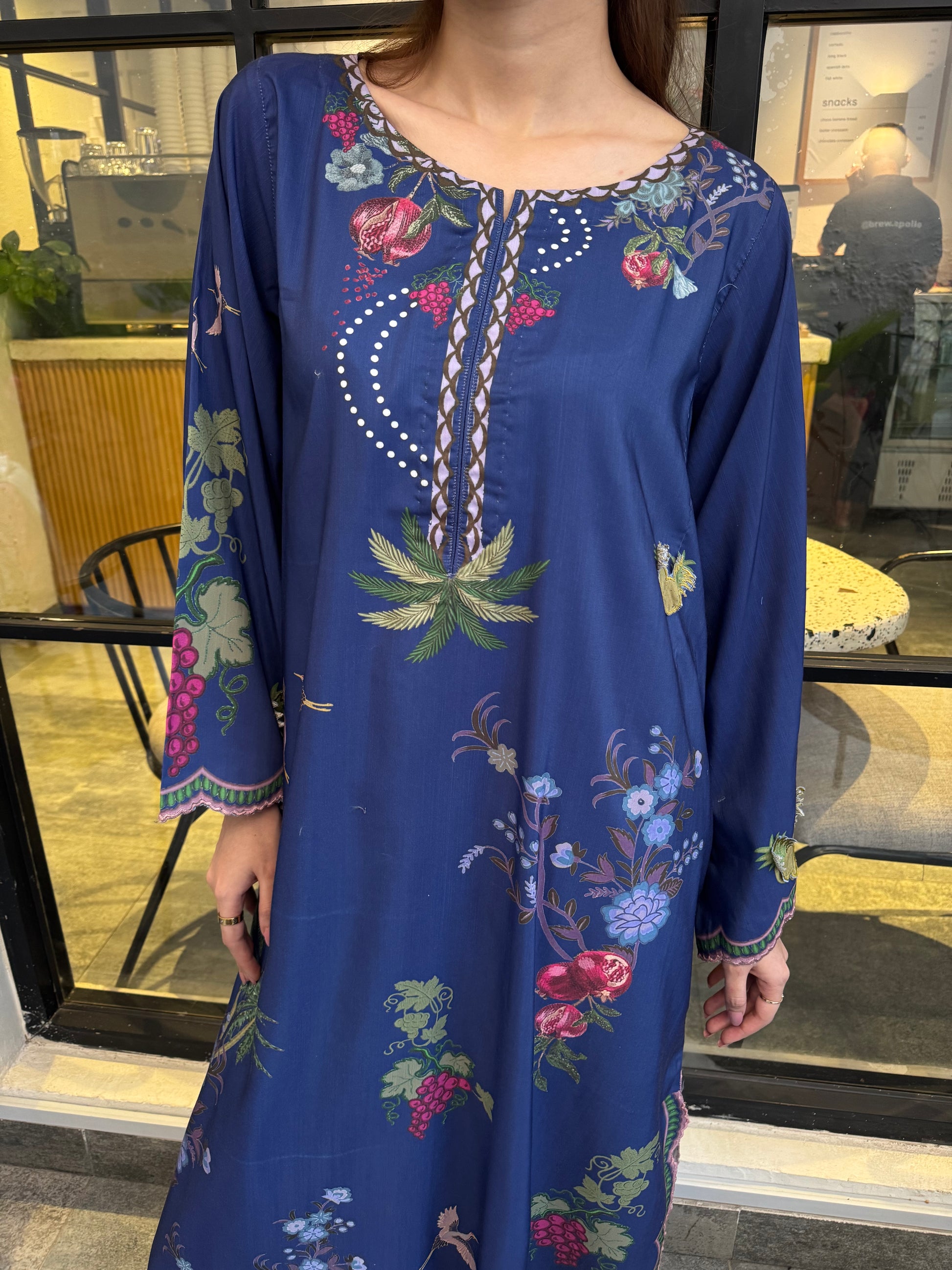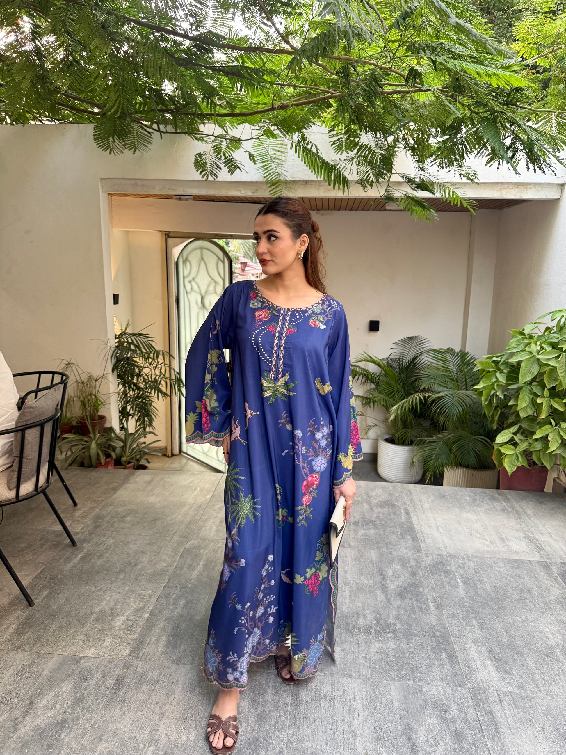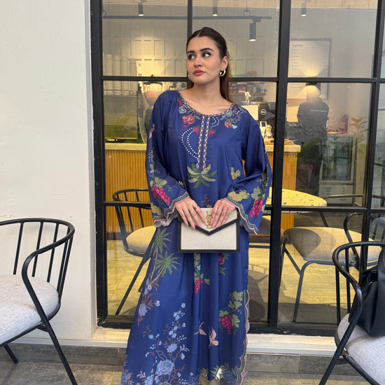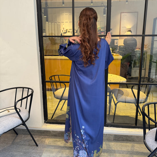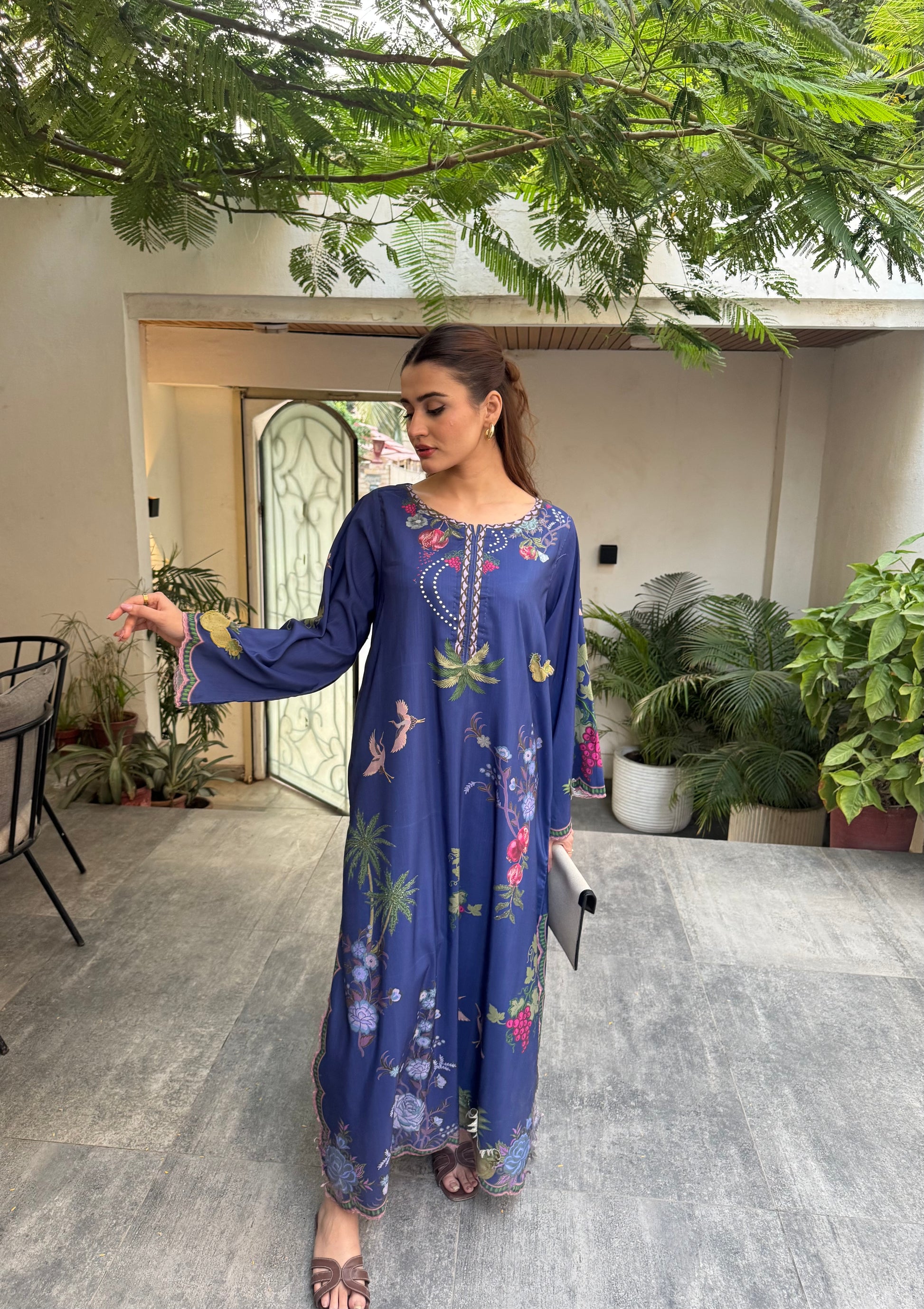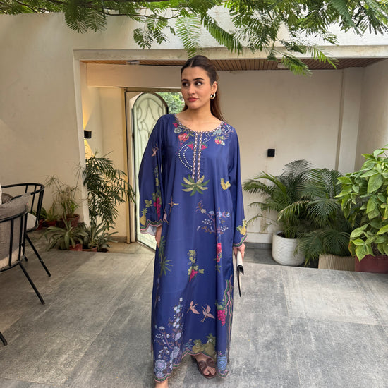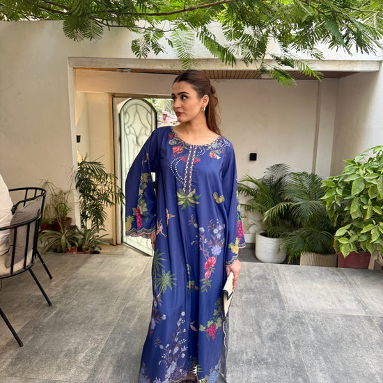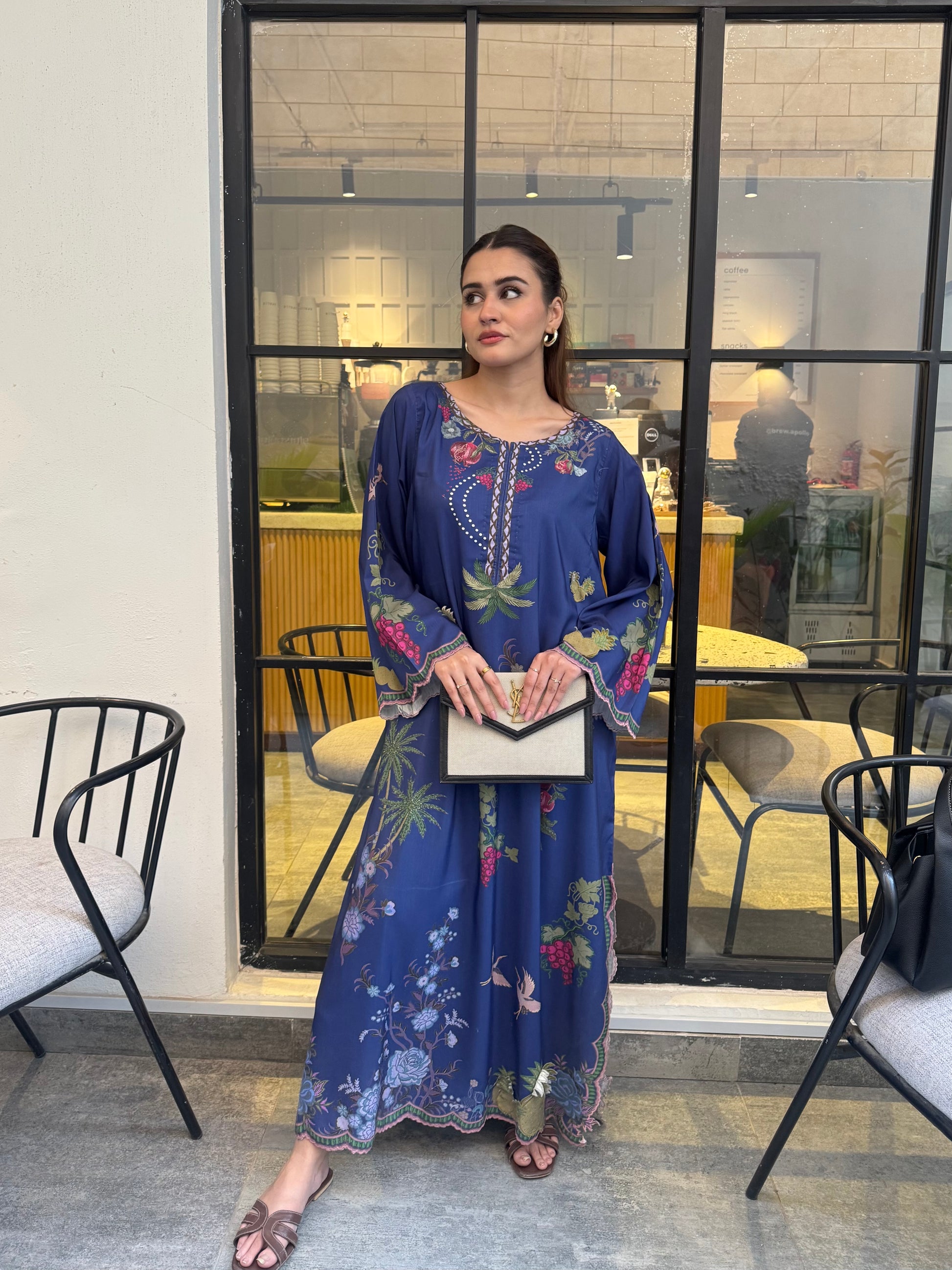 Blue kaftaan made on woolen raw silk boasting 3d pineapple motifs and scallop details on the Chaak, Daman, and sleeves.check the size chart in the pictures to find your perfect size.