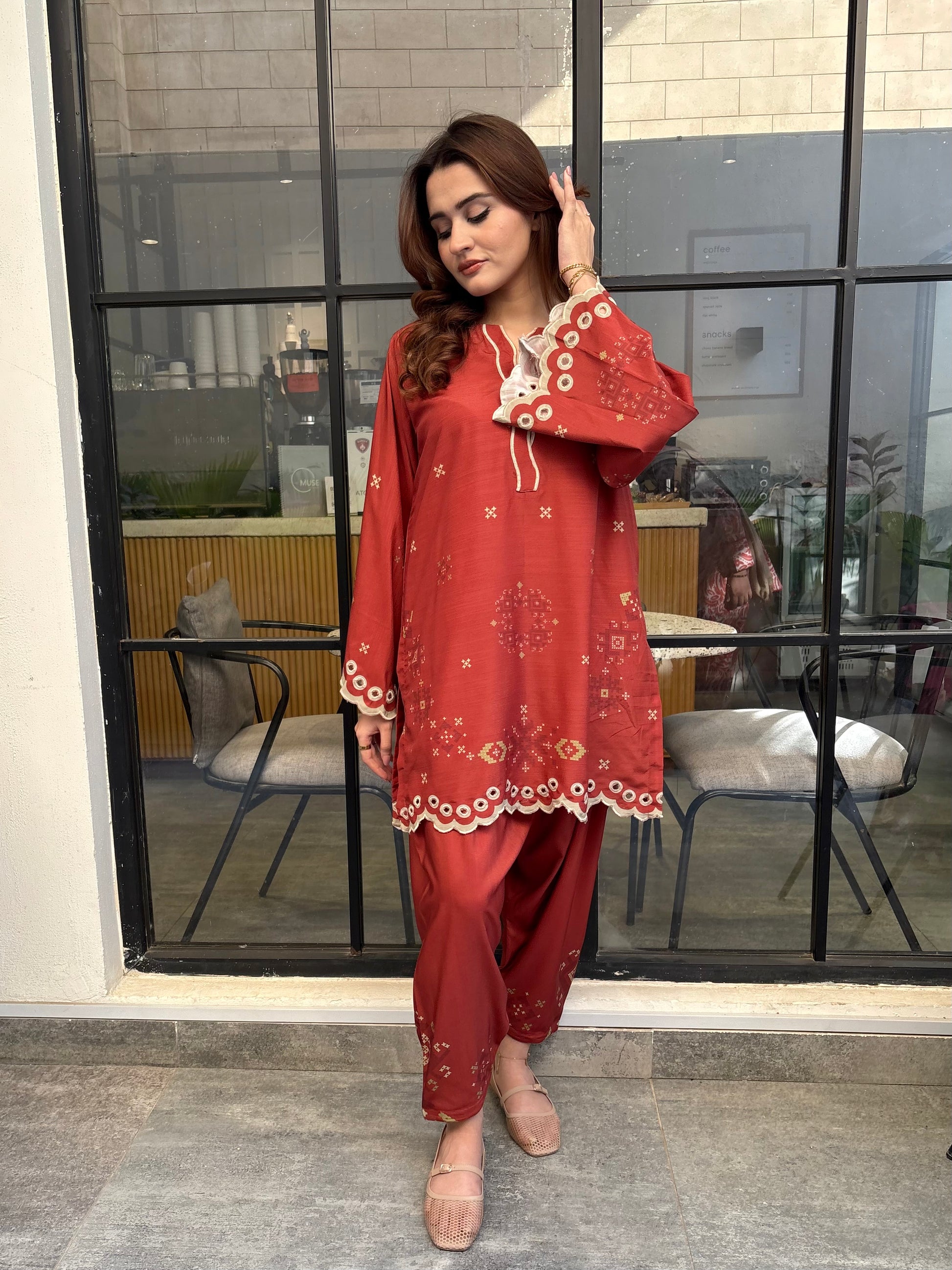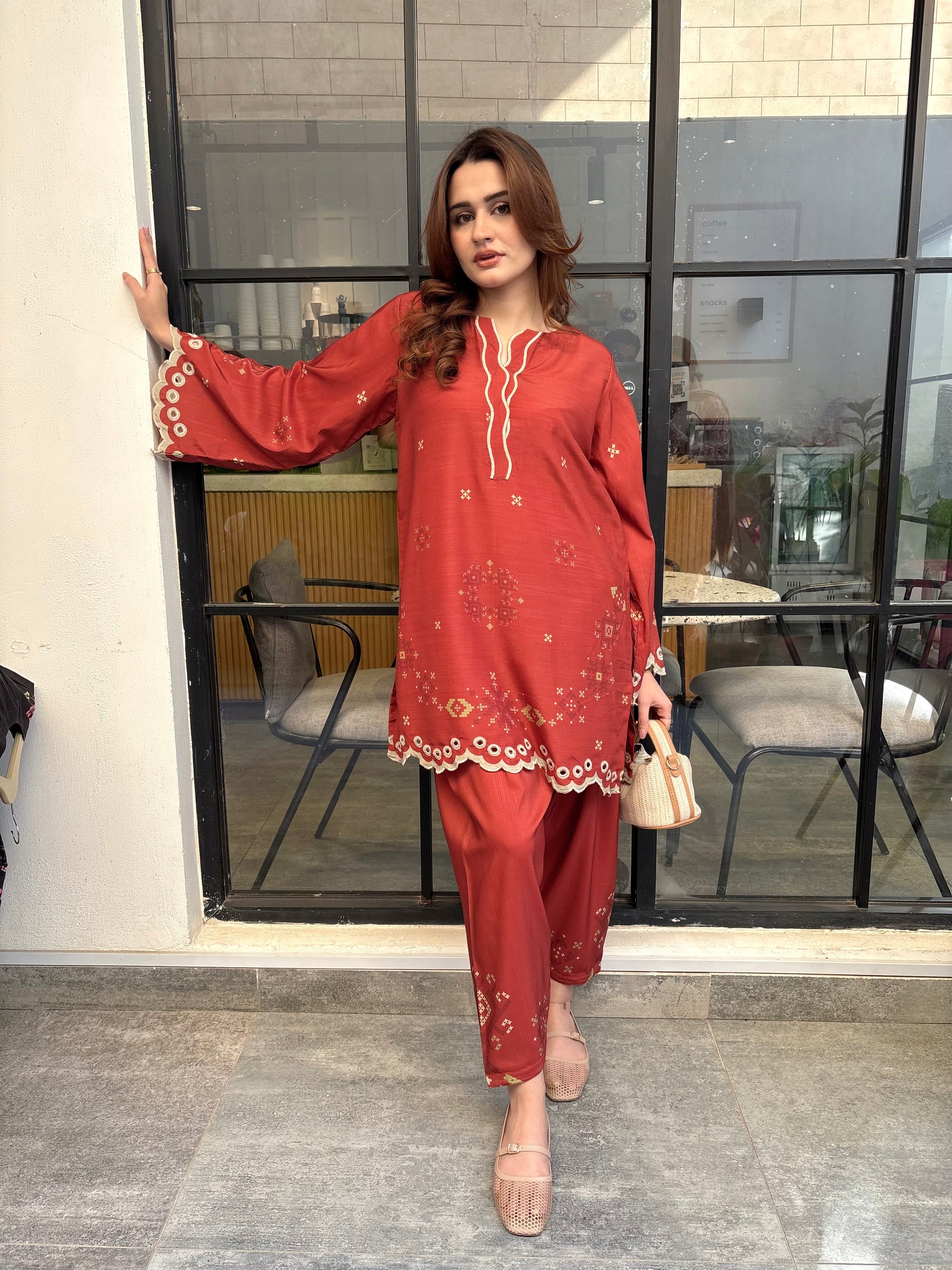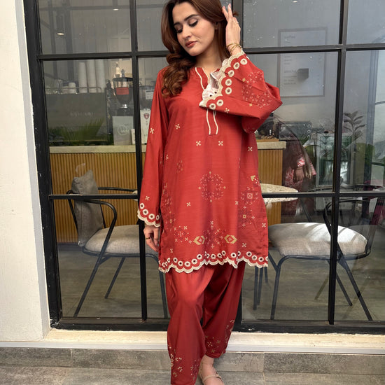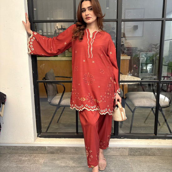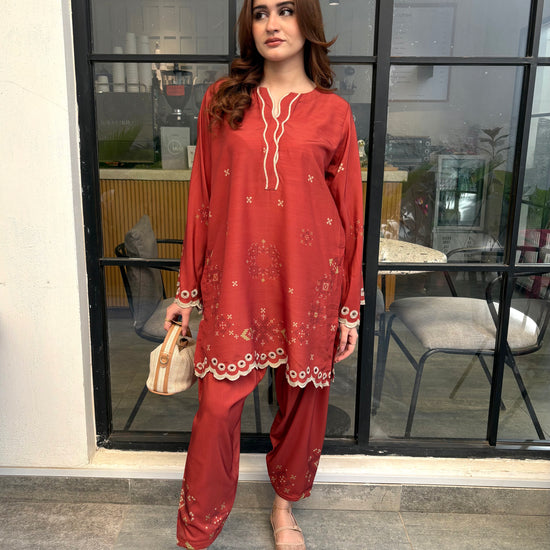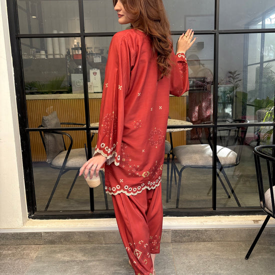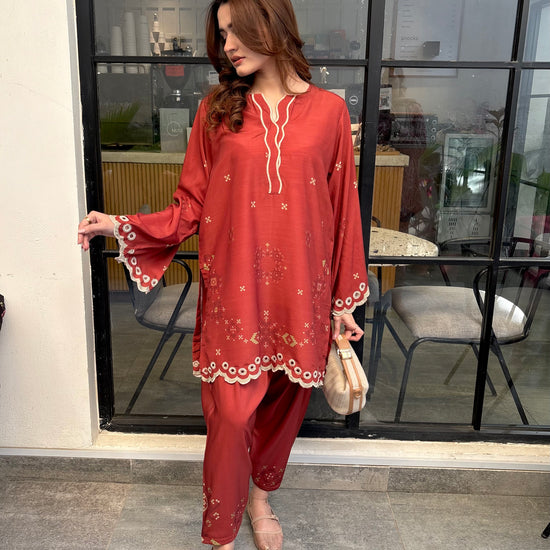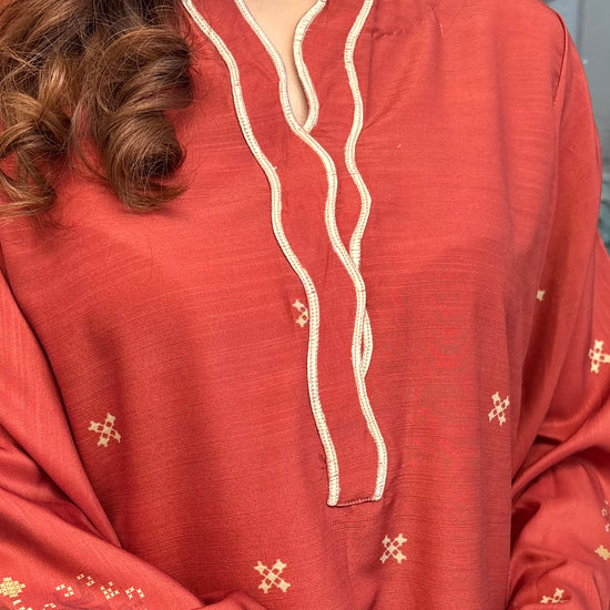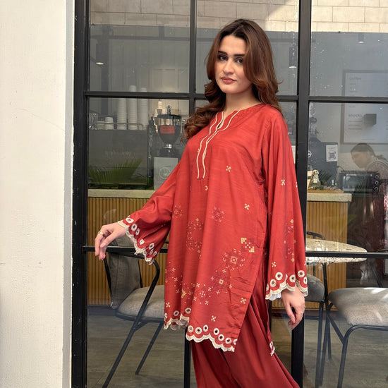 Rust coloured woolen raw silk coord set with digital print, embroidered neckline, and scallop details on Daman and sleeves. Paired with narrow shalwar. Check the size chart in the pictures to find your perfect size.