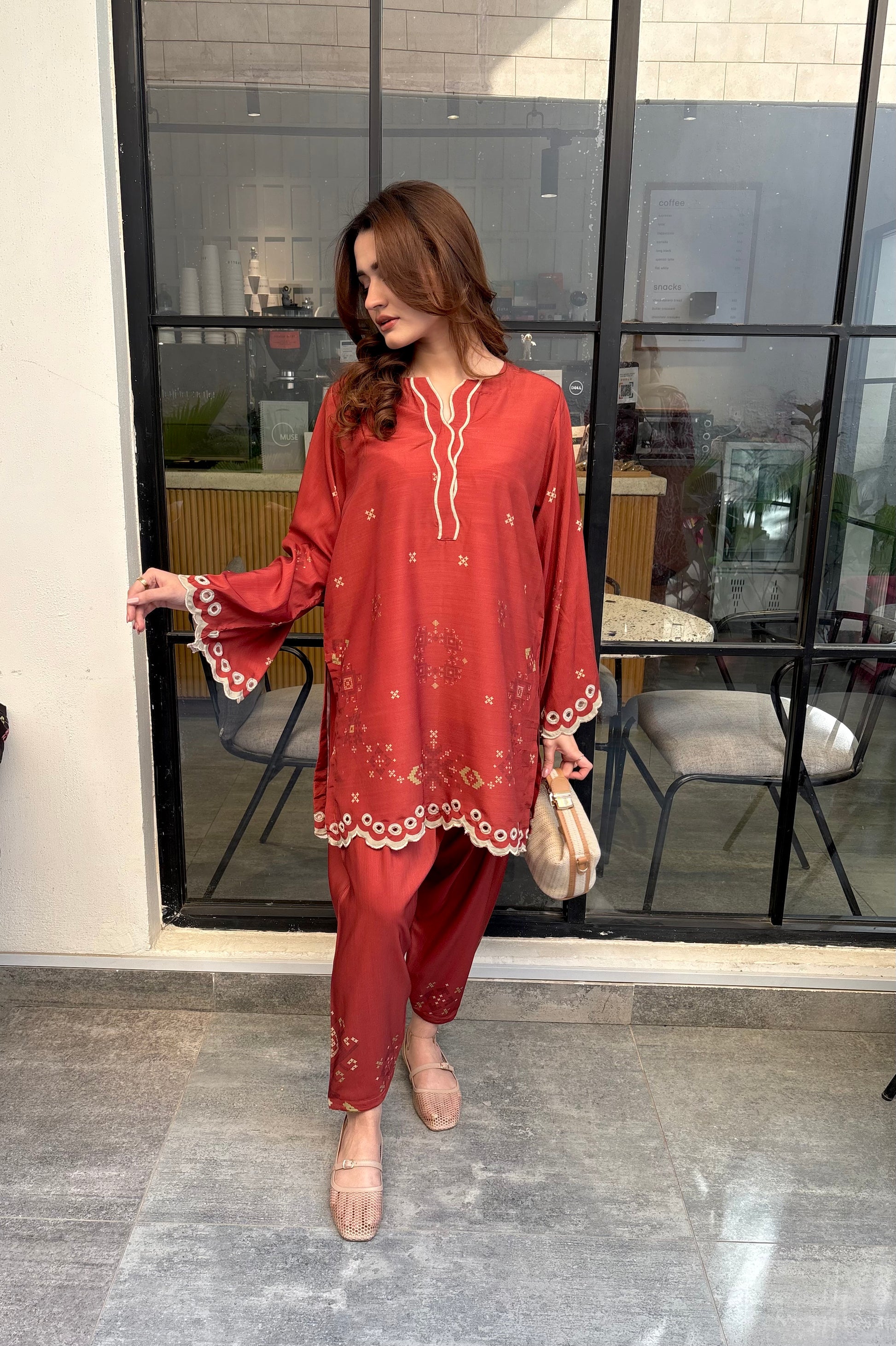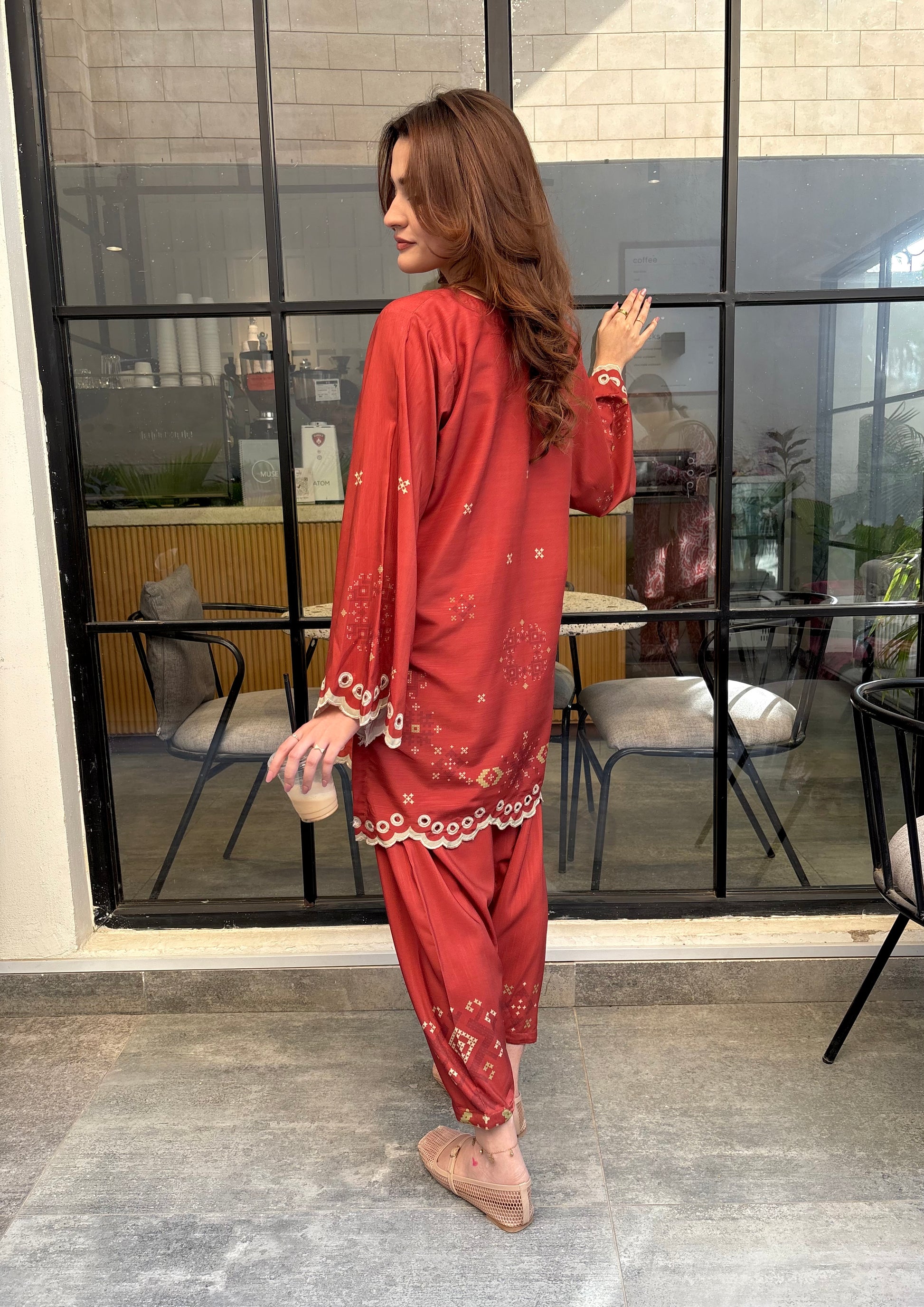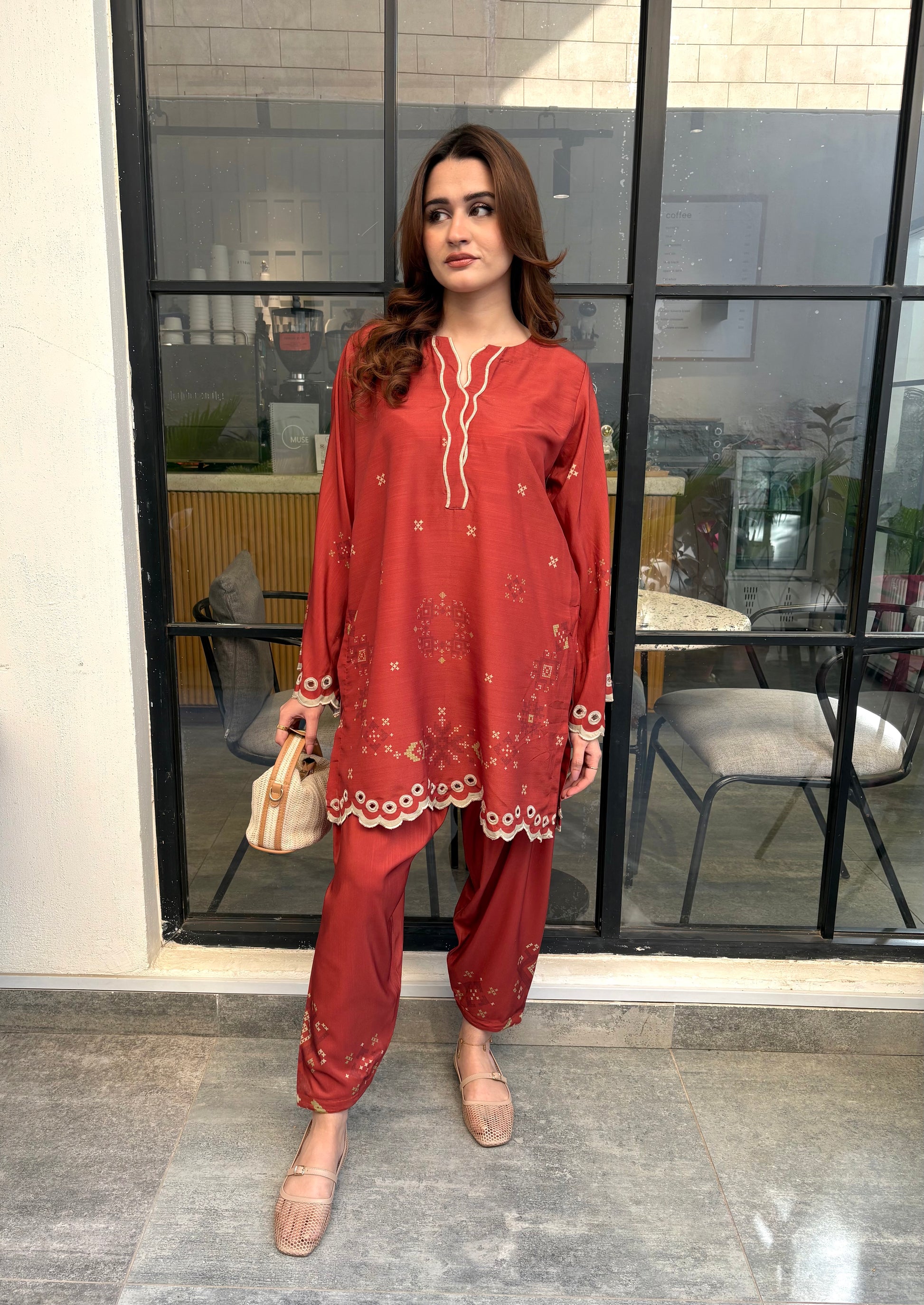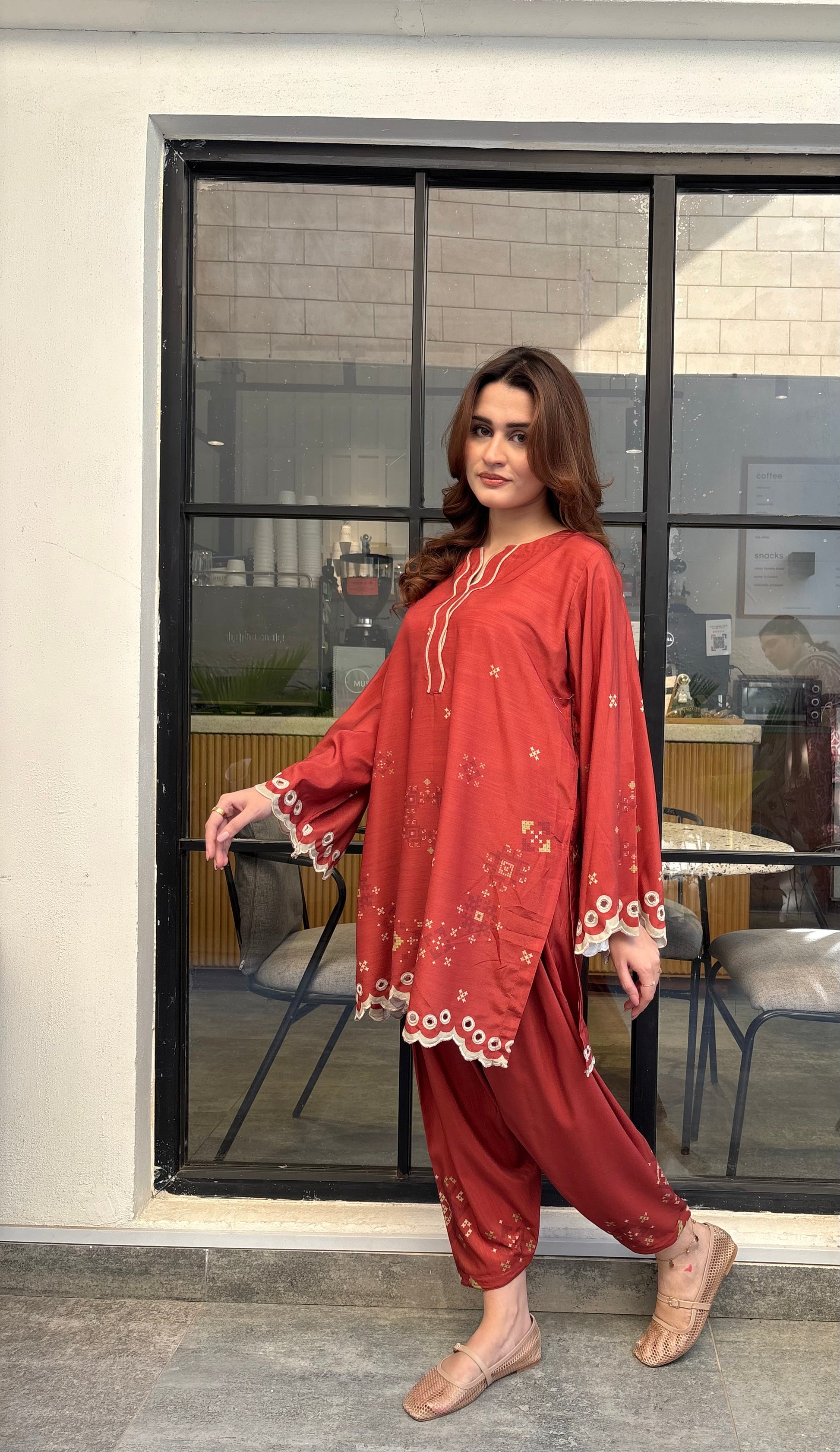 Rust coloured woolen raw silk coord set with digital print, embroidered neckline, and scallop details on Daman and sleeves. Paired with narrow shalwar. Check the size chart in the pictures to find your perfect size.