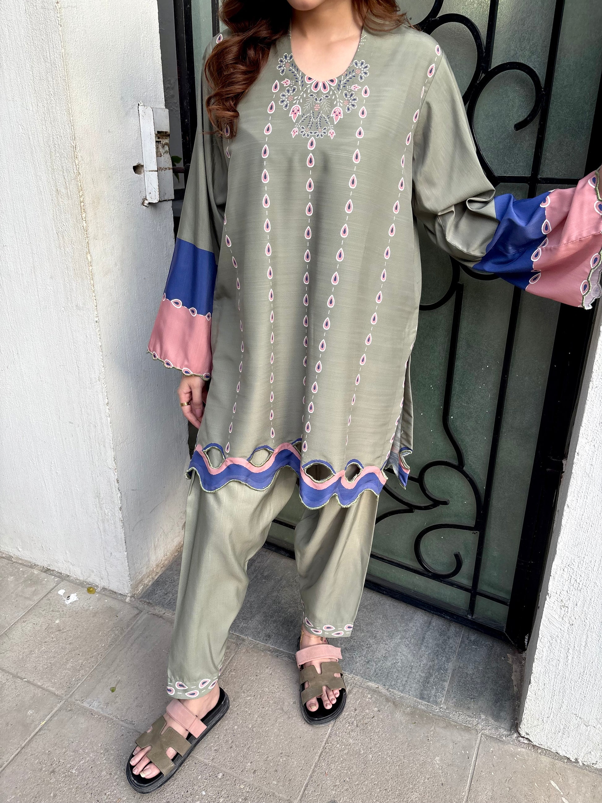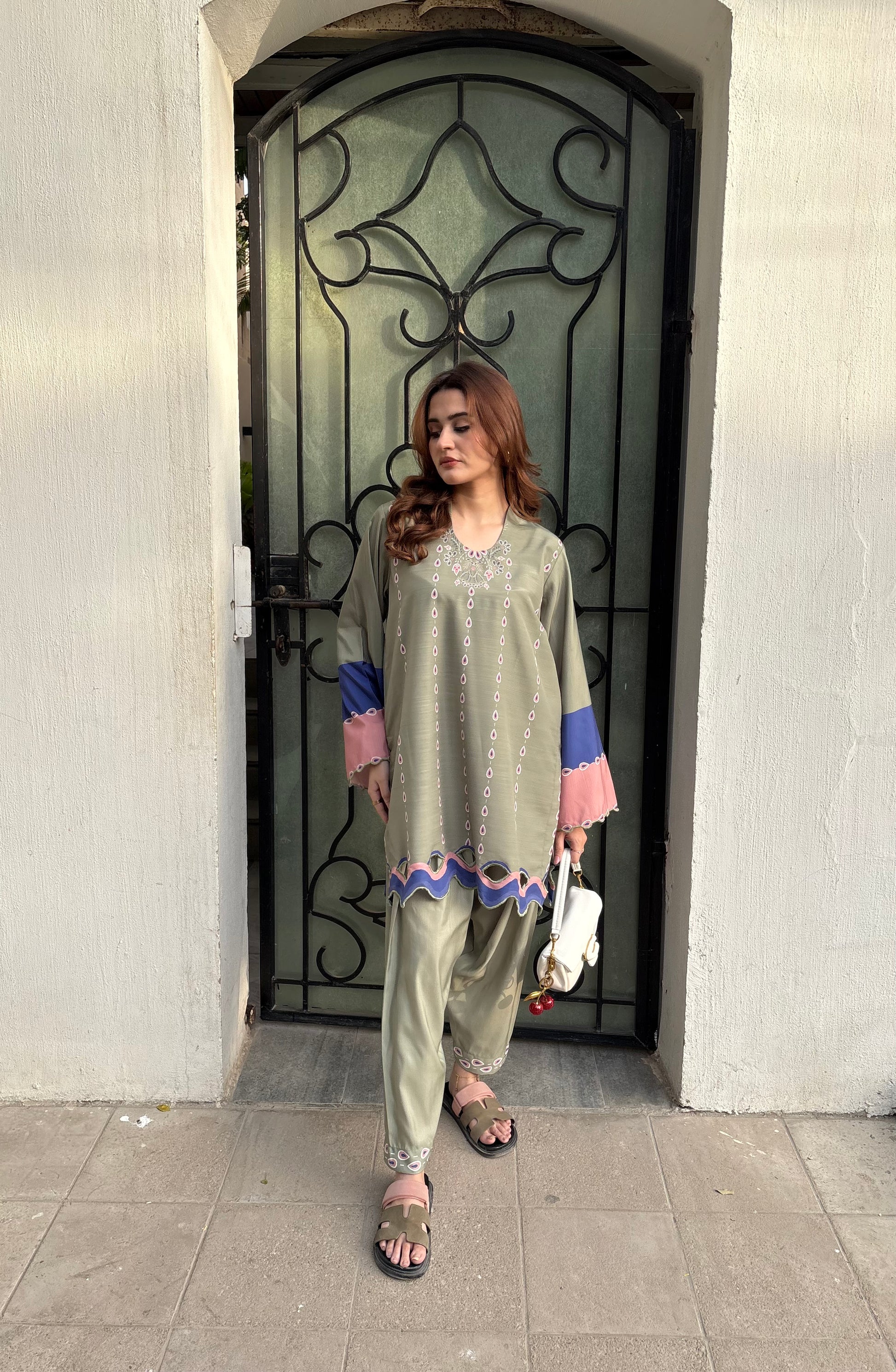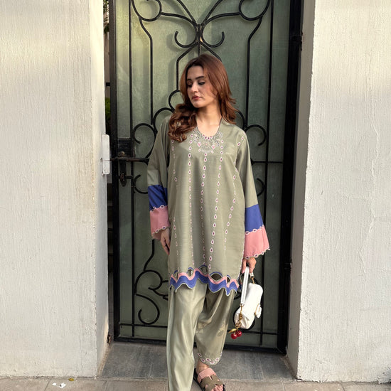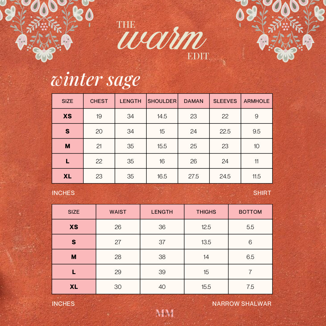 Sage coloured woolen raw silk coord set with digital print, embroidery detailings on Daman and sleeves. Paired with narrow shalwar. Check the size chart in the pictures to find your perfect size.