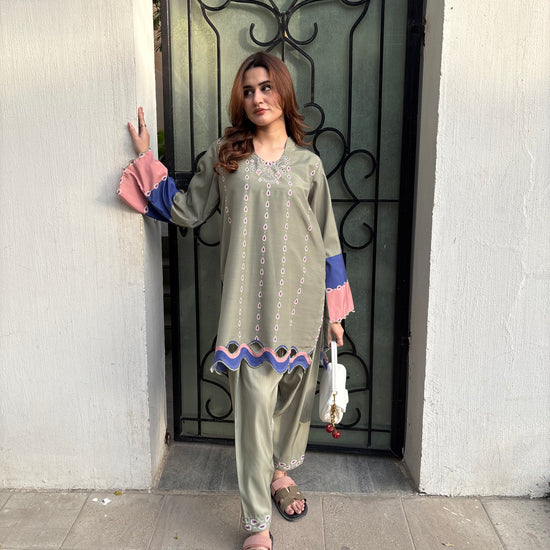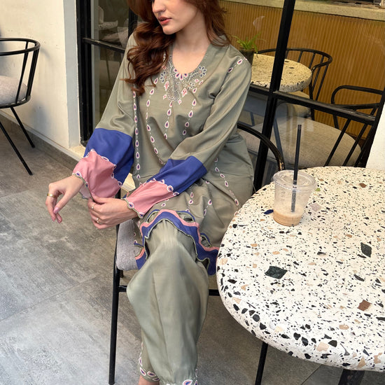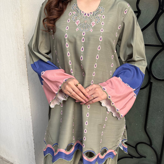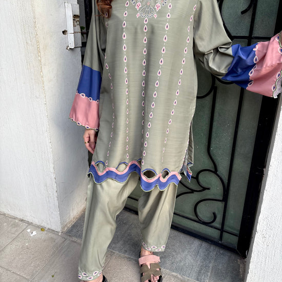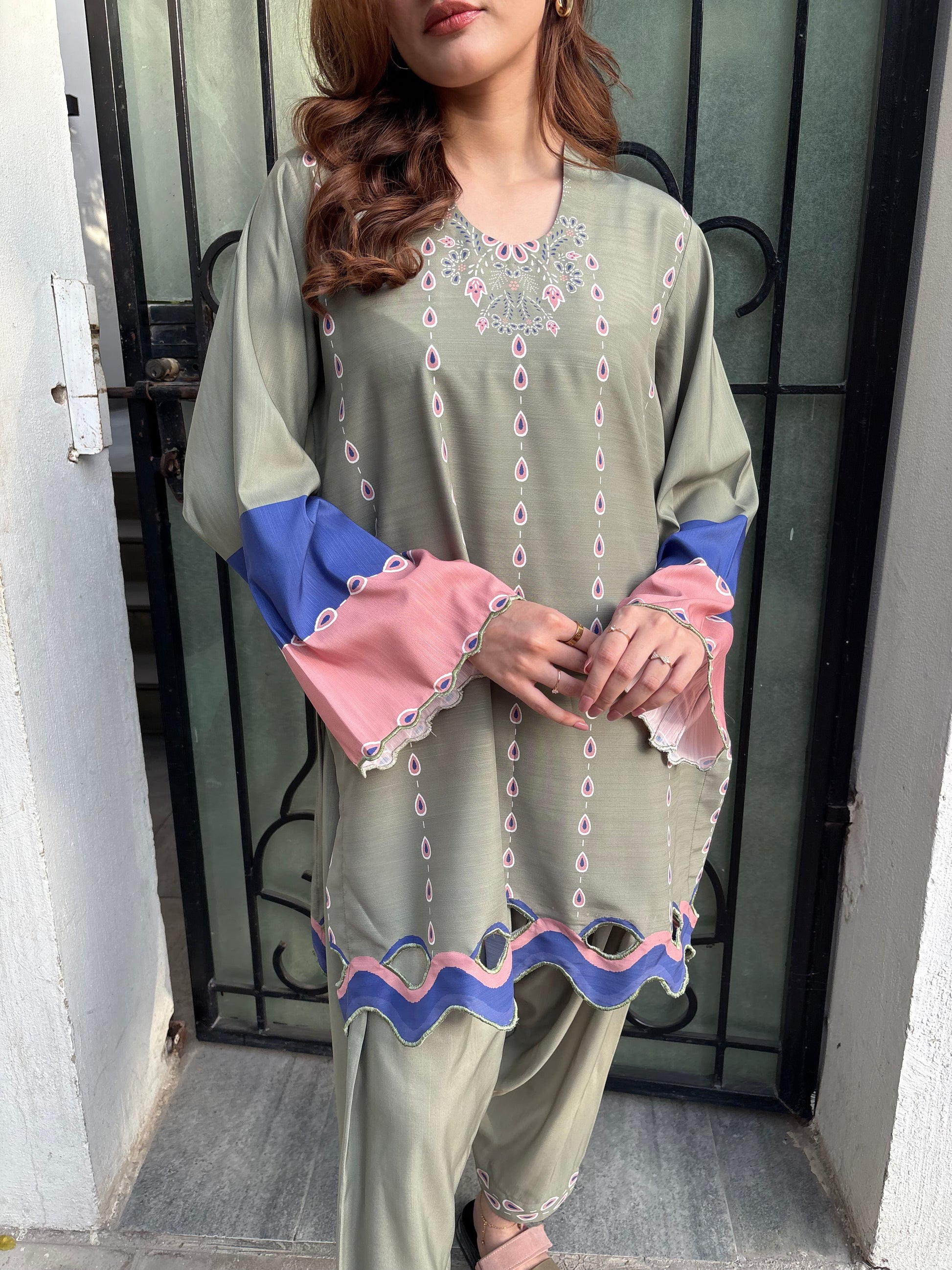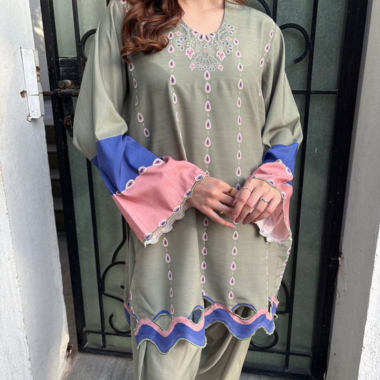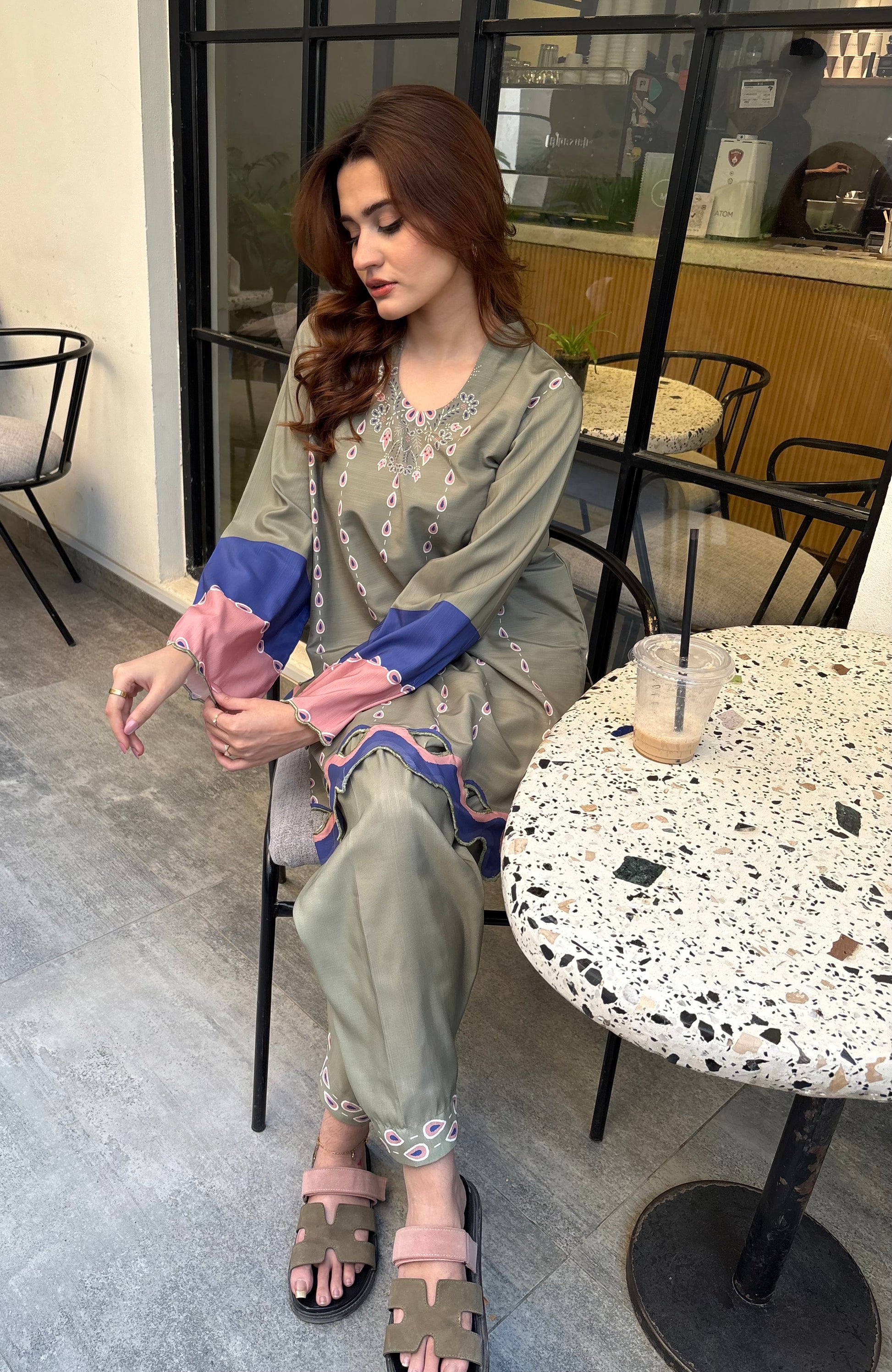 Sage coloured woolen raw silk coord set with digital print, embroidery detailings on Daman and sleeves. Paired with narrow shalwar. Check the size chart in the pictures to find your perfect size.