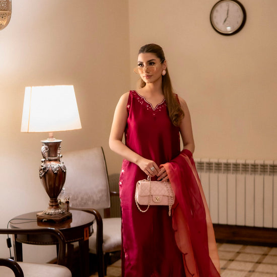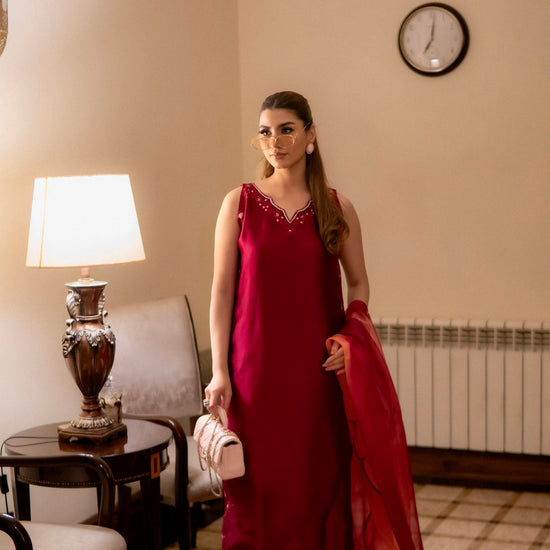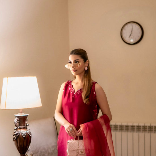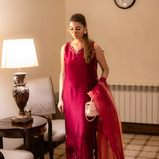 A luxurious deep maroon ensemble features a sleeveless long shirt (sleeves available upon request), paired with loose trousers and intricate same-colour embroidery. The outfit is complemented by a dupatta with a subtle pink undertone and elegant scallop detailing, exuding refined elegance.