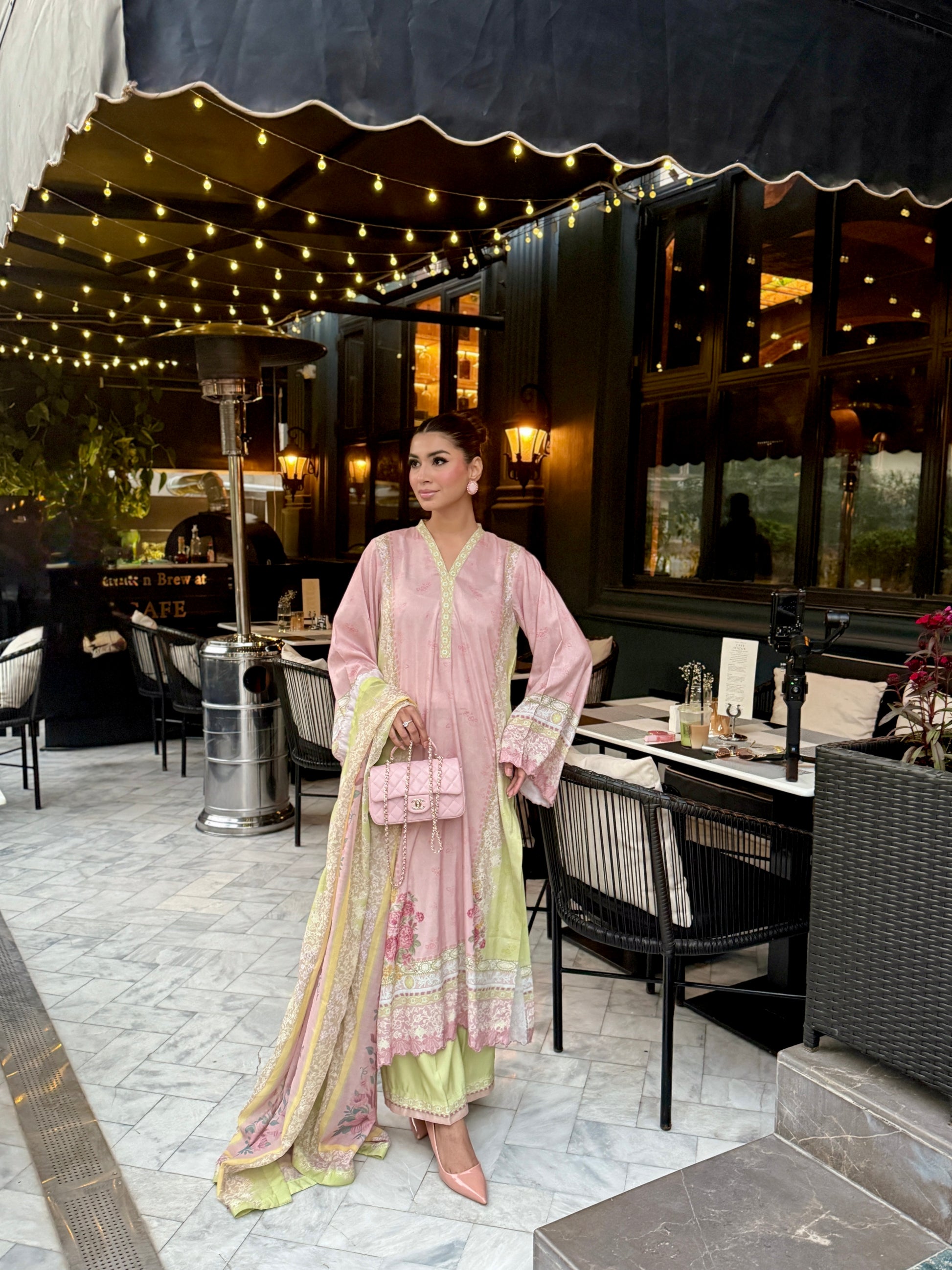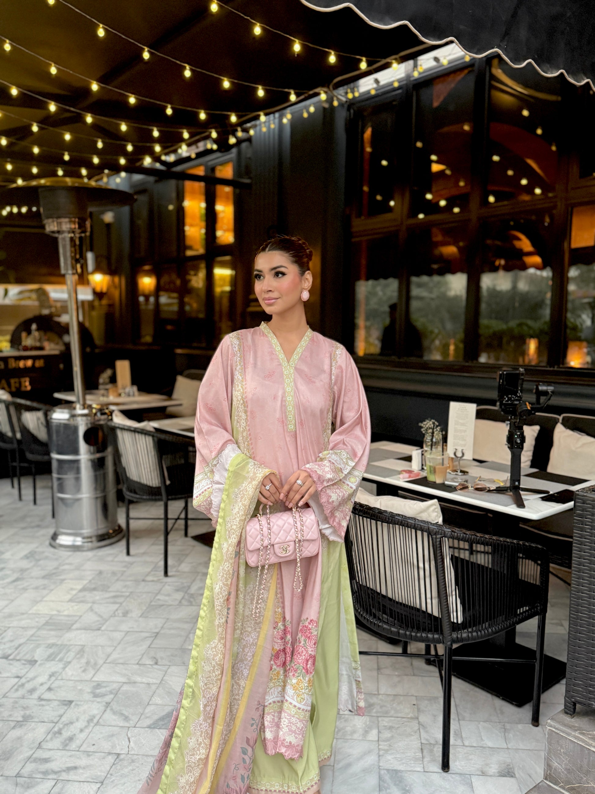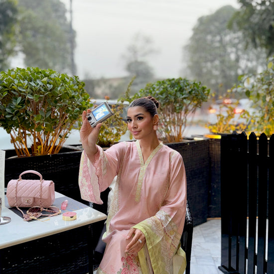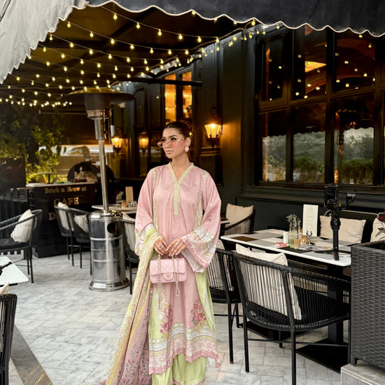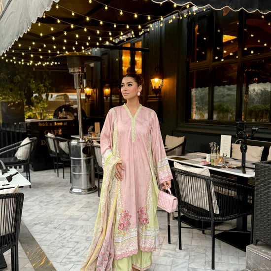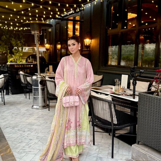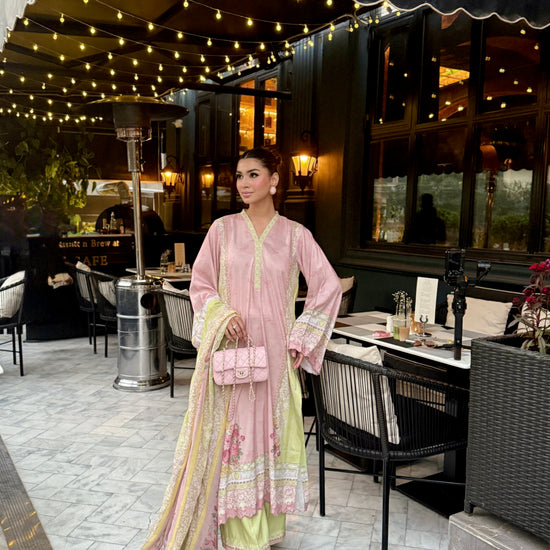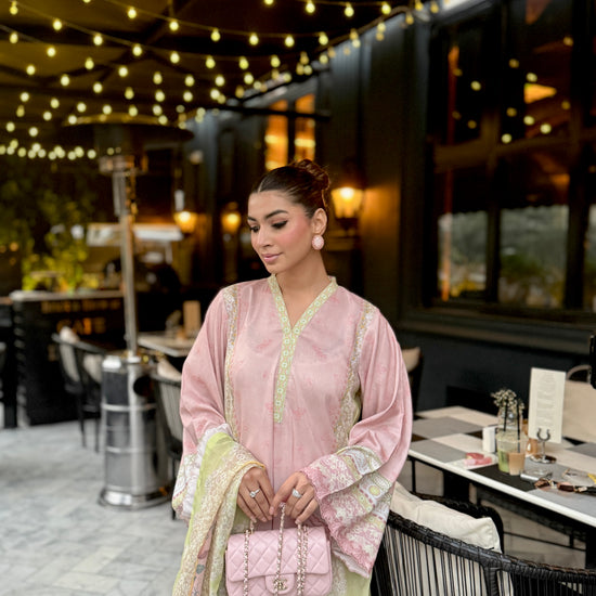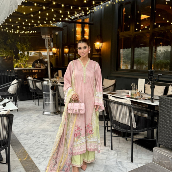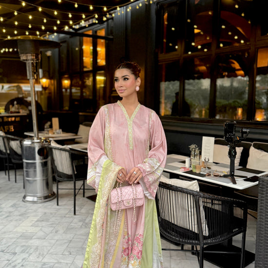 Baby pink and light green outfit with yellow accents, featuring floral prints on the shirt and dupatta. The long shirt has loose sleeves with embroidery on sleeves and Daman, paired with plain trousers having organza detailing, adding a touch of elegance to the outfit.
