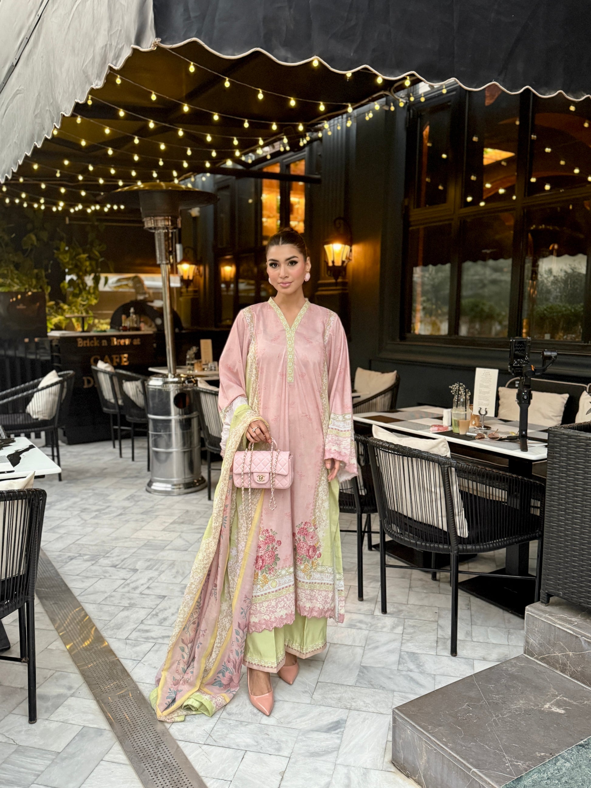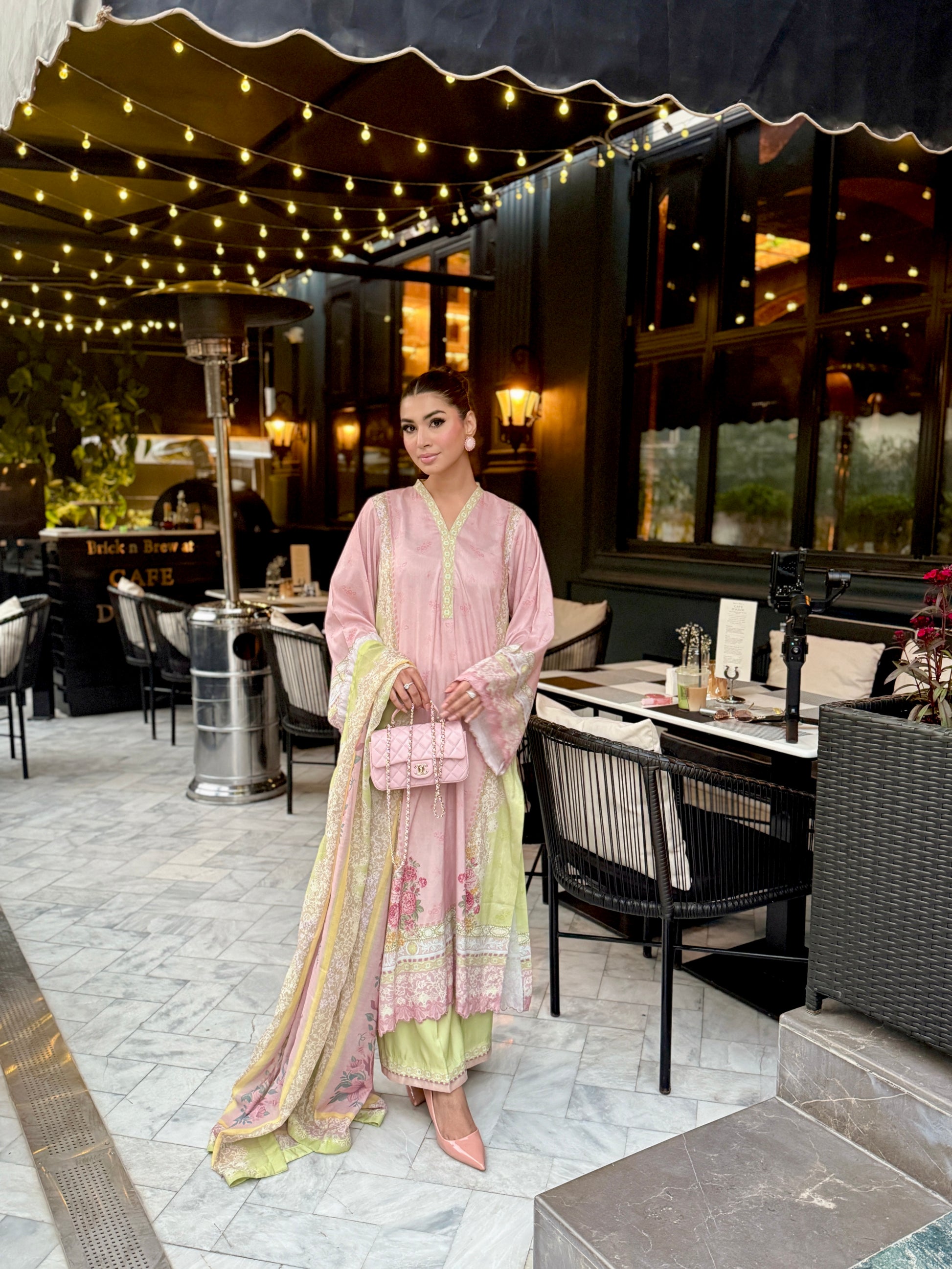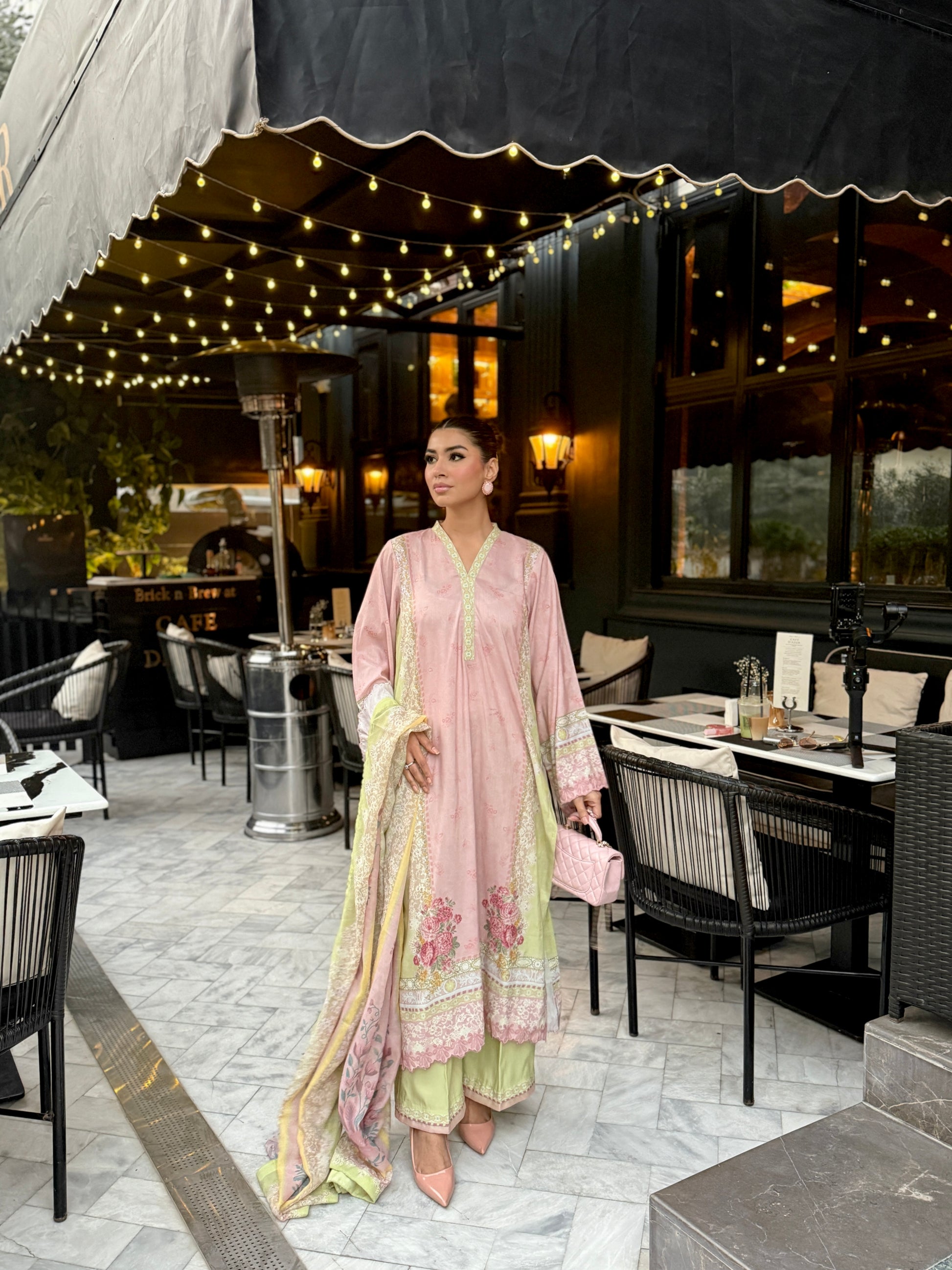 Baby pink and light green outfit with yellow accents, featuring floral prints on the shirt and dupatta. The long shirt has loose sleeves with embroidery on sleeves and Daman, paired with plain trousers having organza detailing, adding a touch of elegance to the outfit.