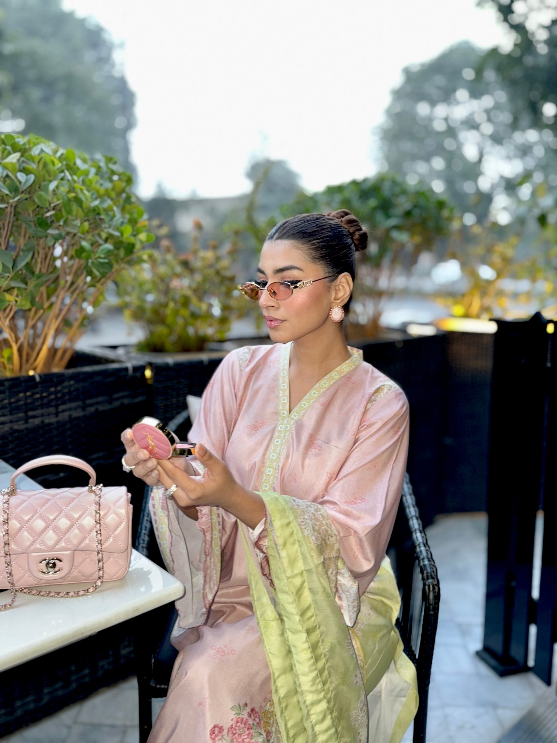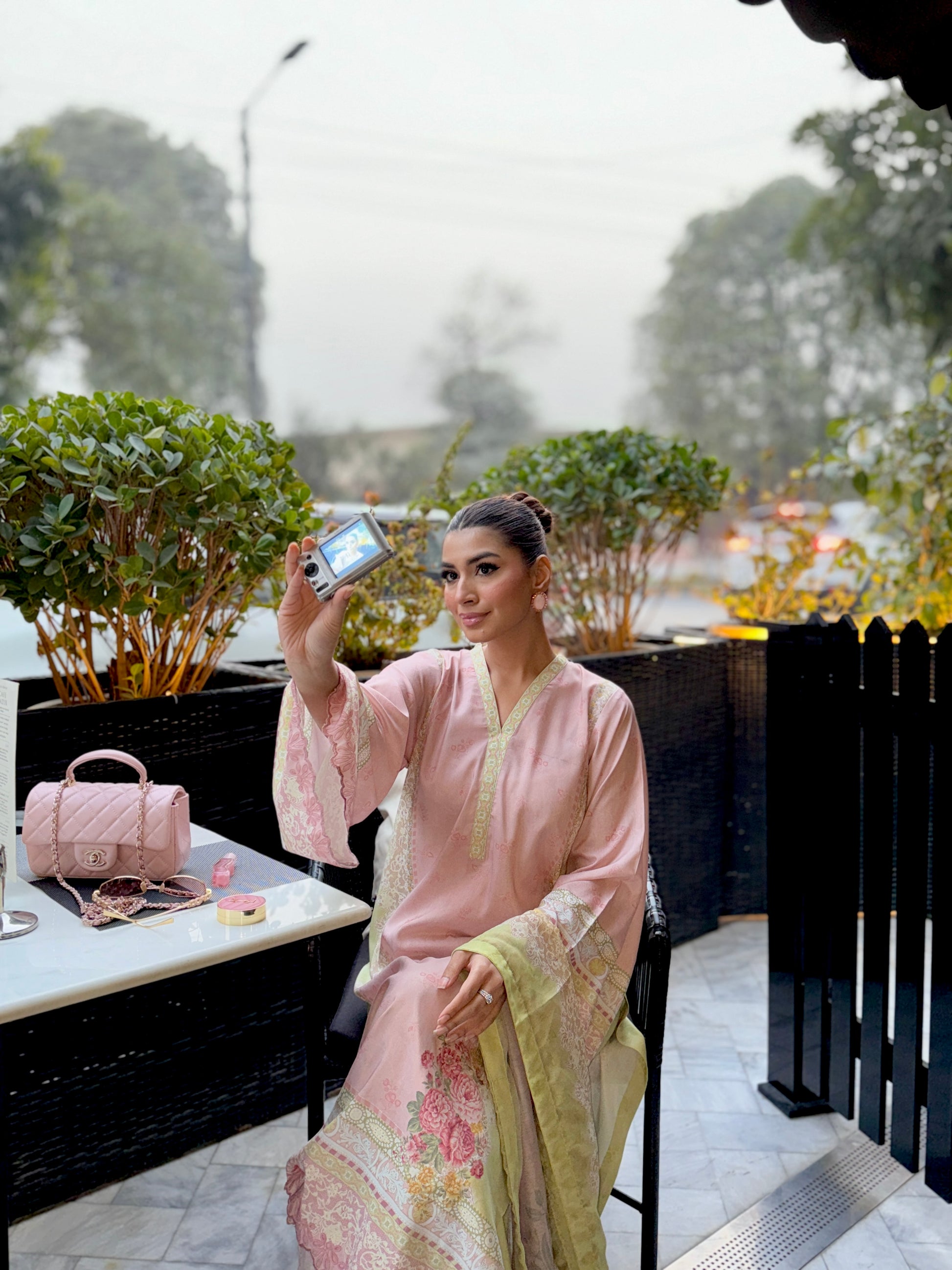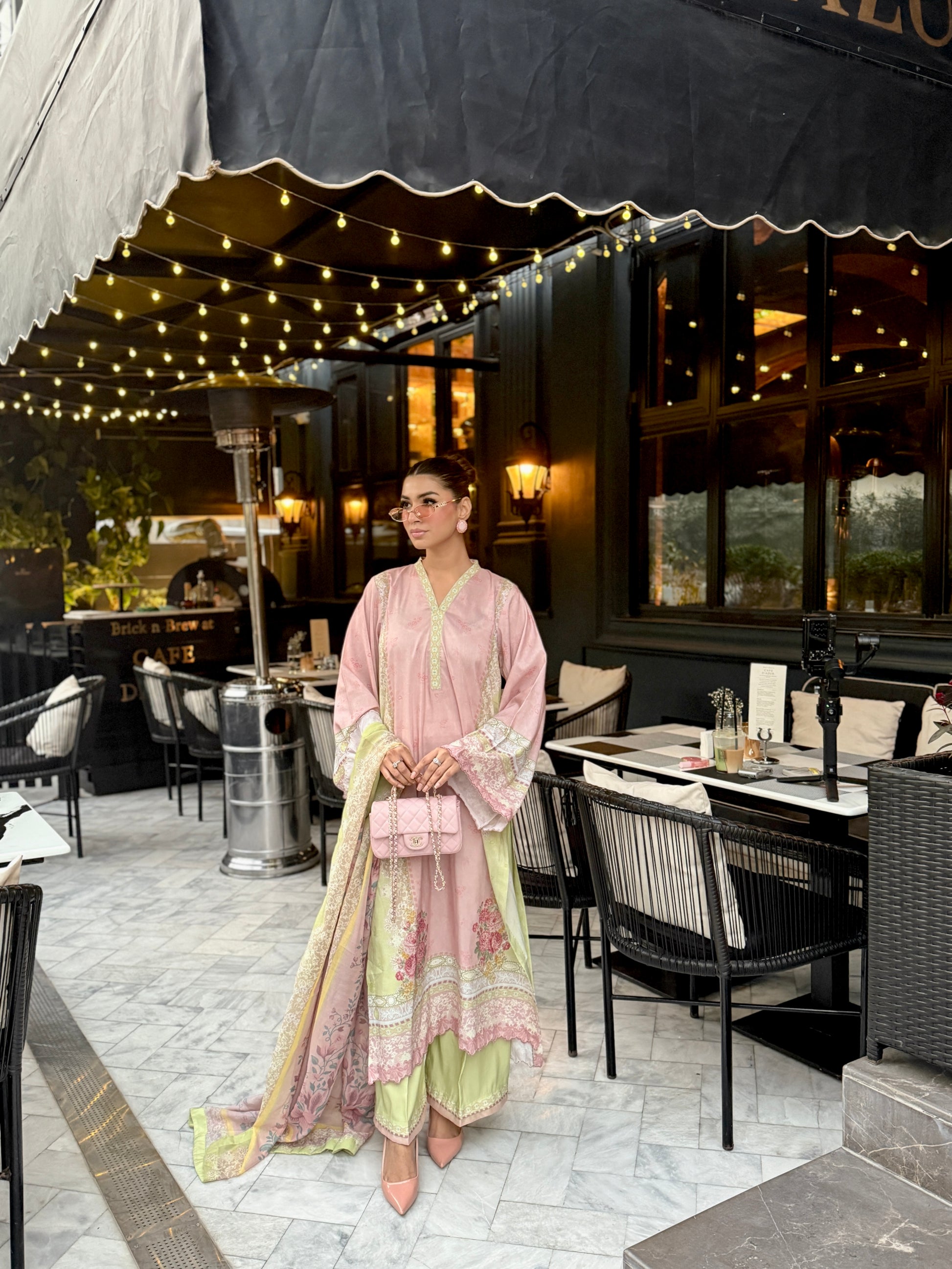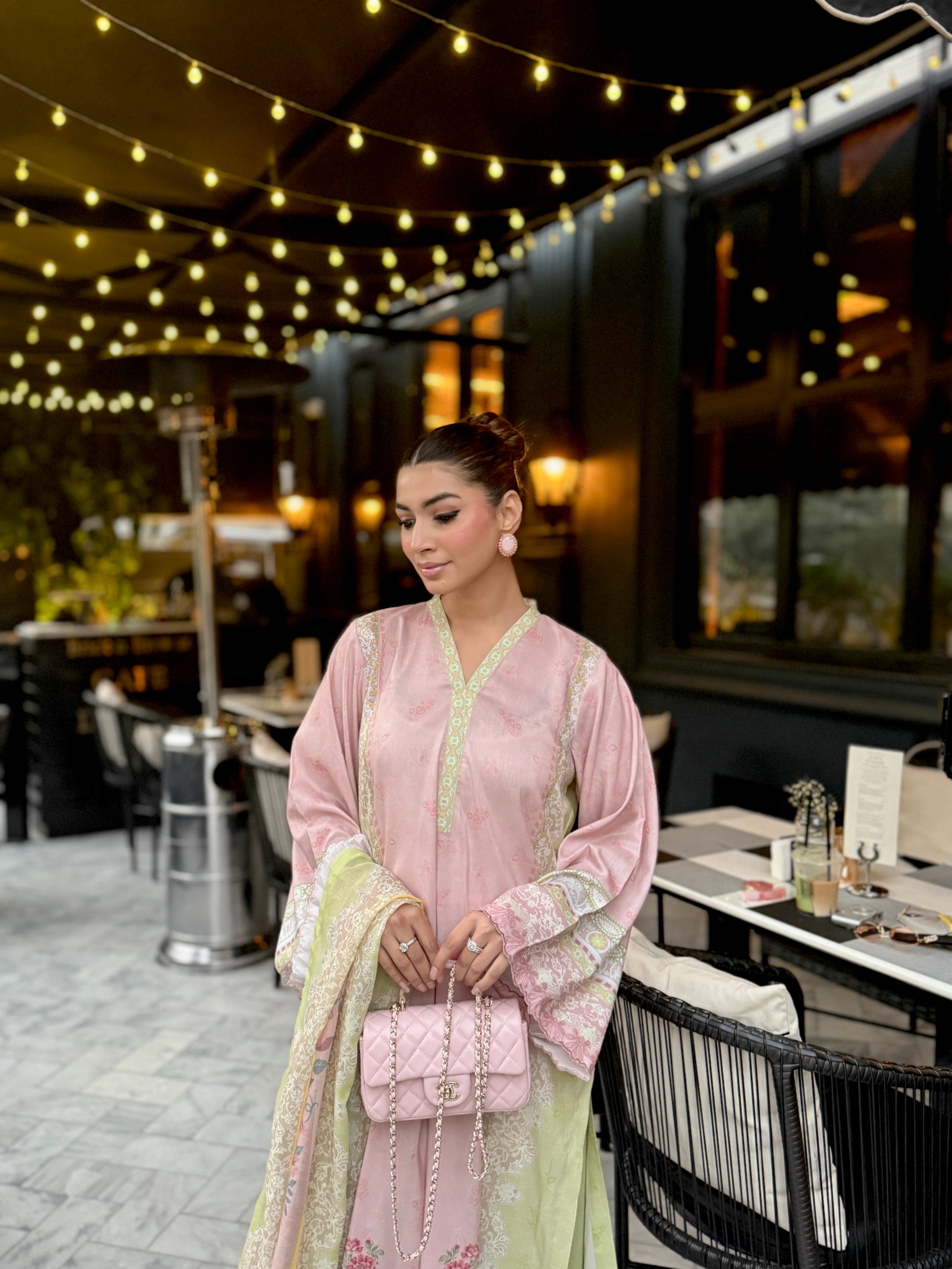 Baby pink and light green outfit with yellow accents, featuring floral prints on the shirt and dupatta. The long shirt has loose sleeves with embroidery on sleeves and Daman, paired with plain trousers having organza detailing, adding a touch of elegance to the outfit.