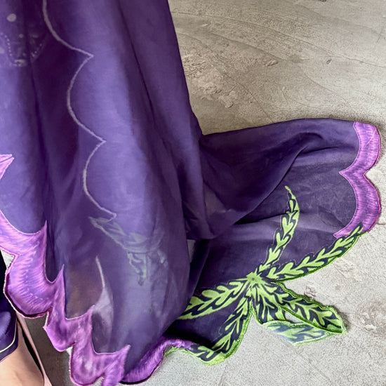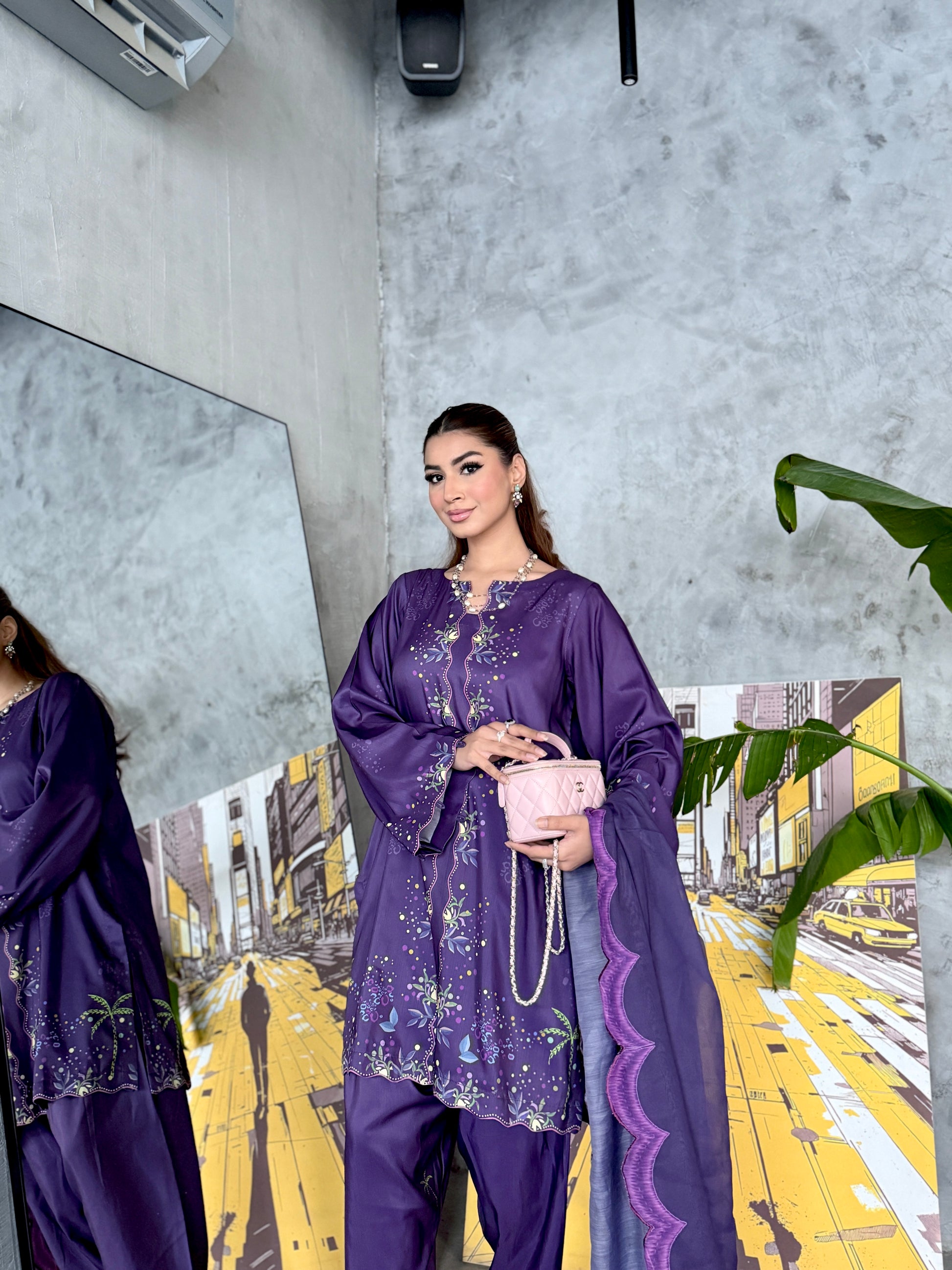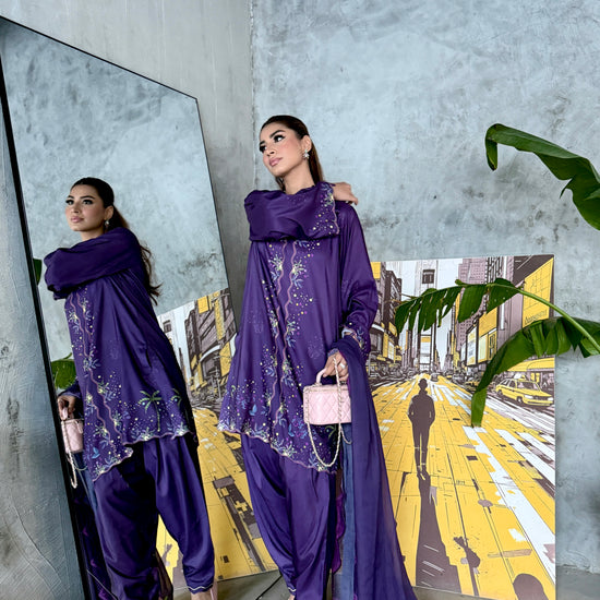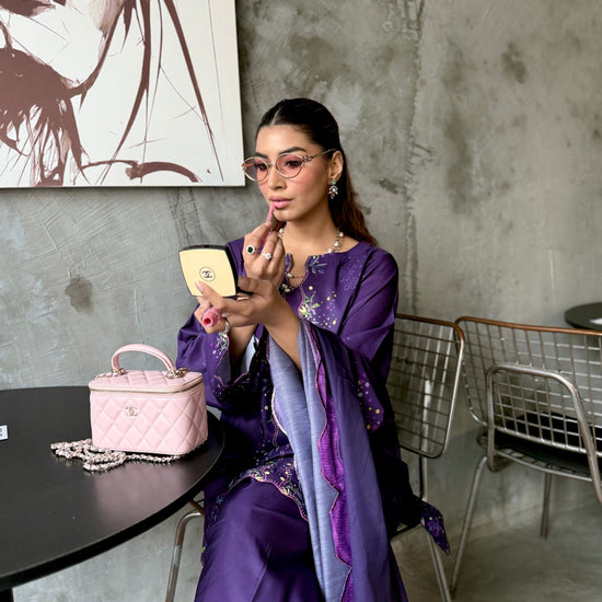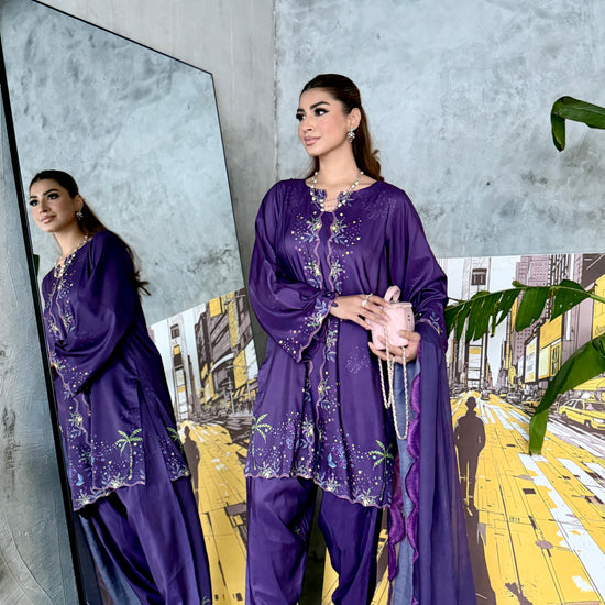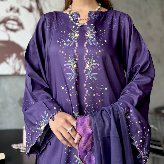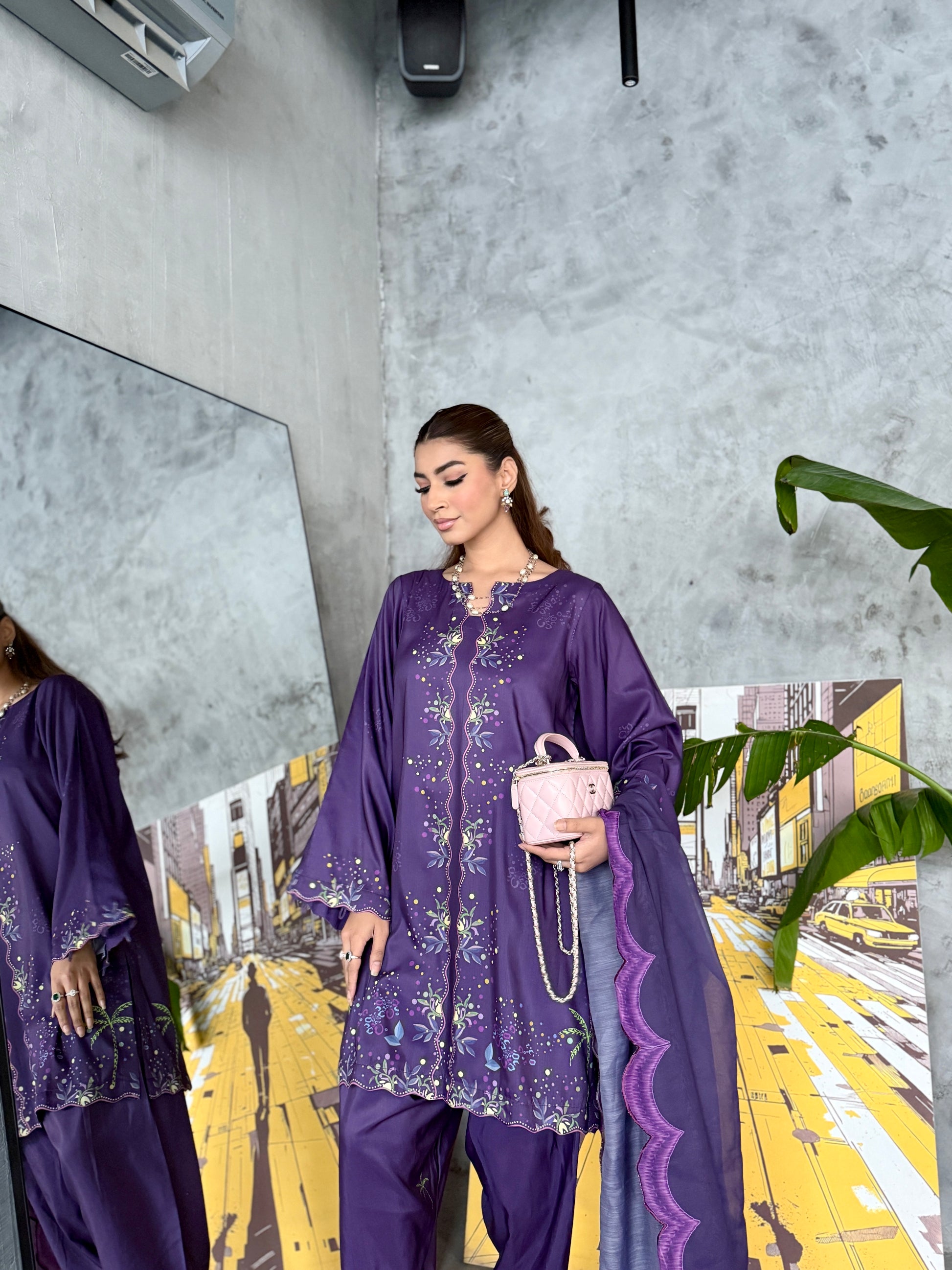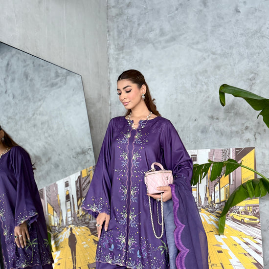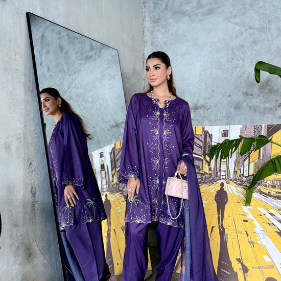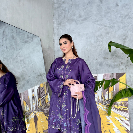 A beautiful purple coord set features loop detailing on sleeves and narrow shalwar, showcasing an eye-catching print. Paired with a stunning embroidered dupatta,this ensemble is perfect for making a stylish statement.