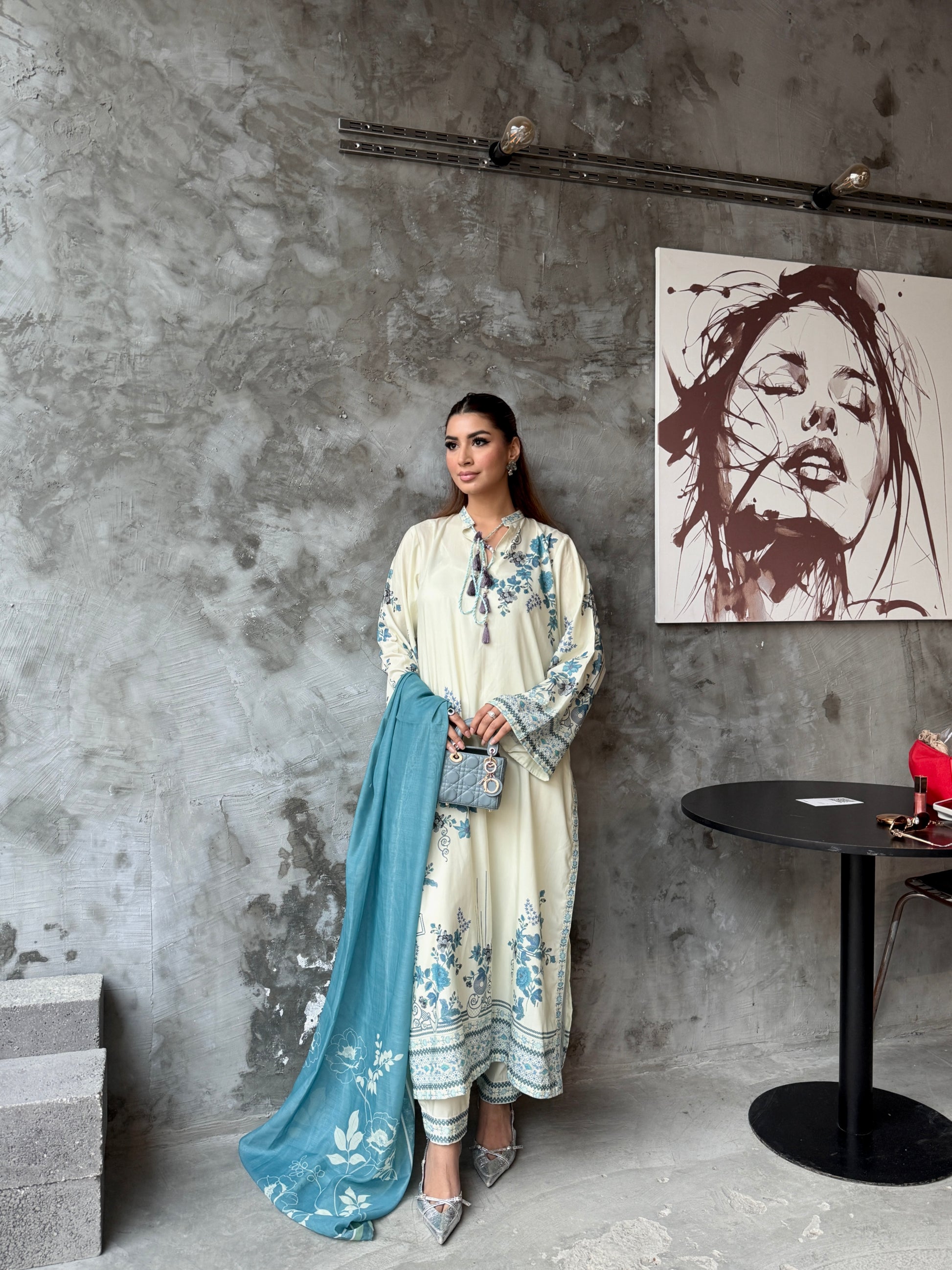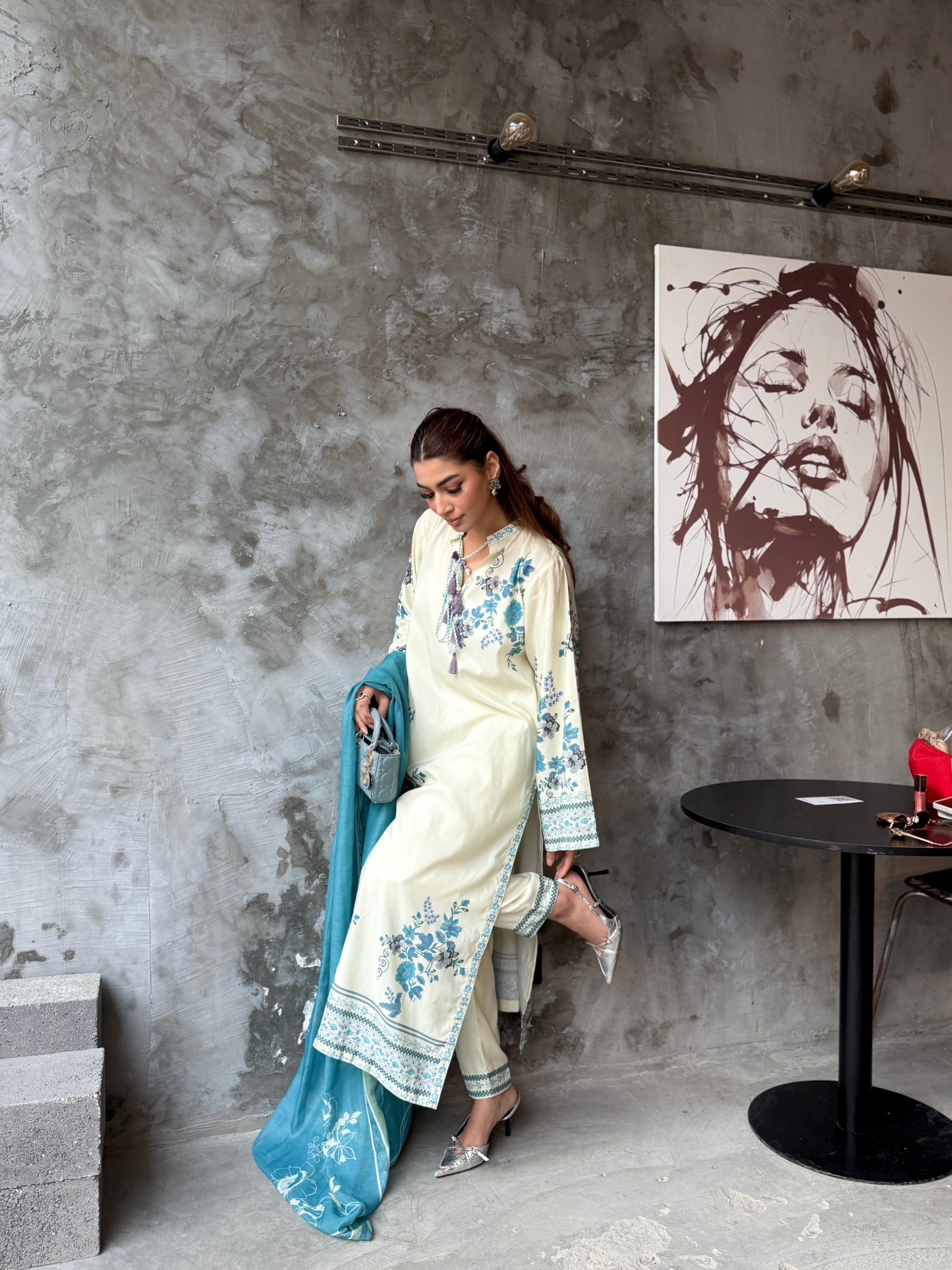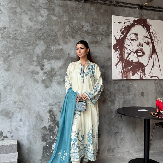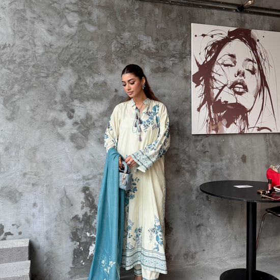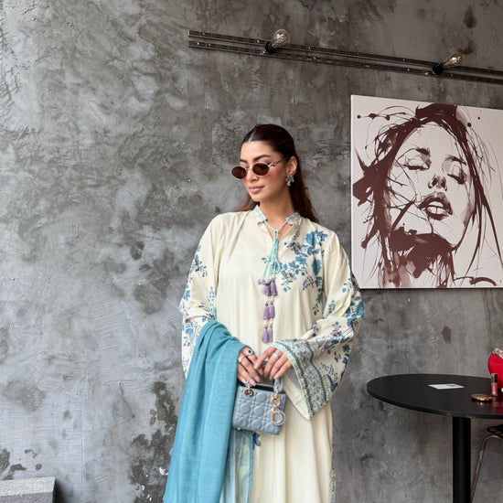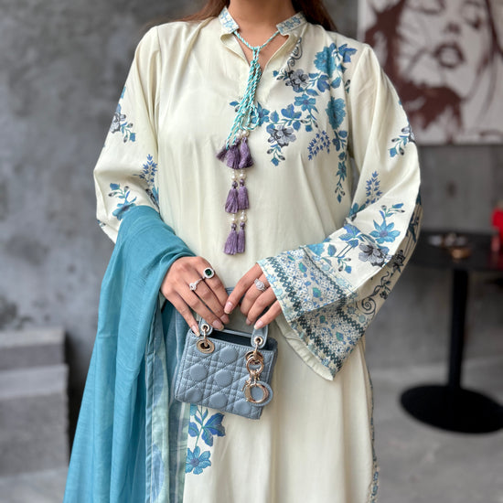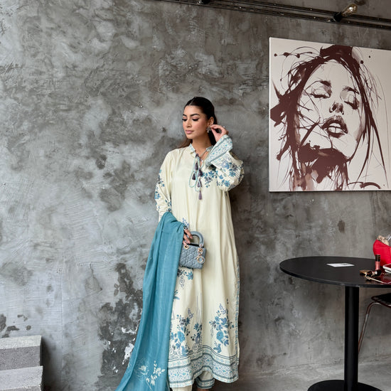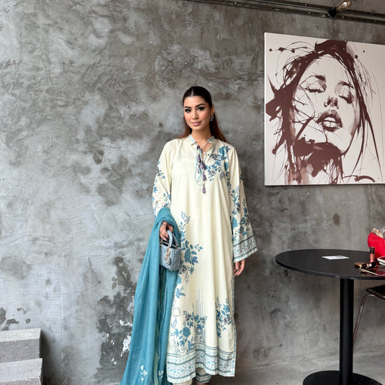 Elegant cream and blue ensemble with collared tassels neckline, flowy shirt, and straight trouser. Paired with a blue-green dupatta featuring botanical print. Perfect for Eid or Iftari gatherings.