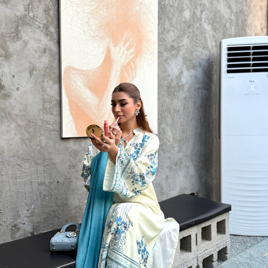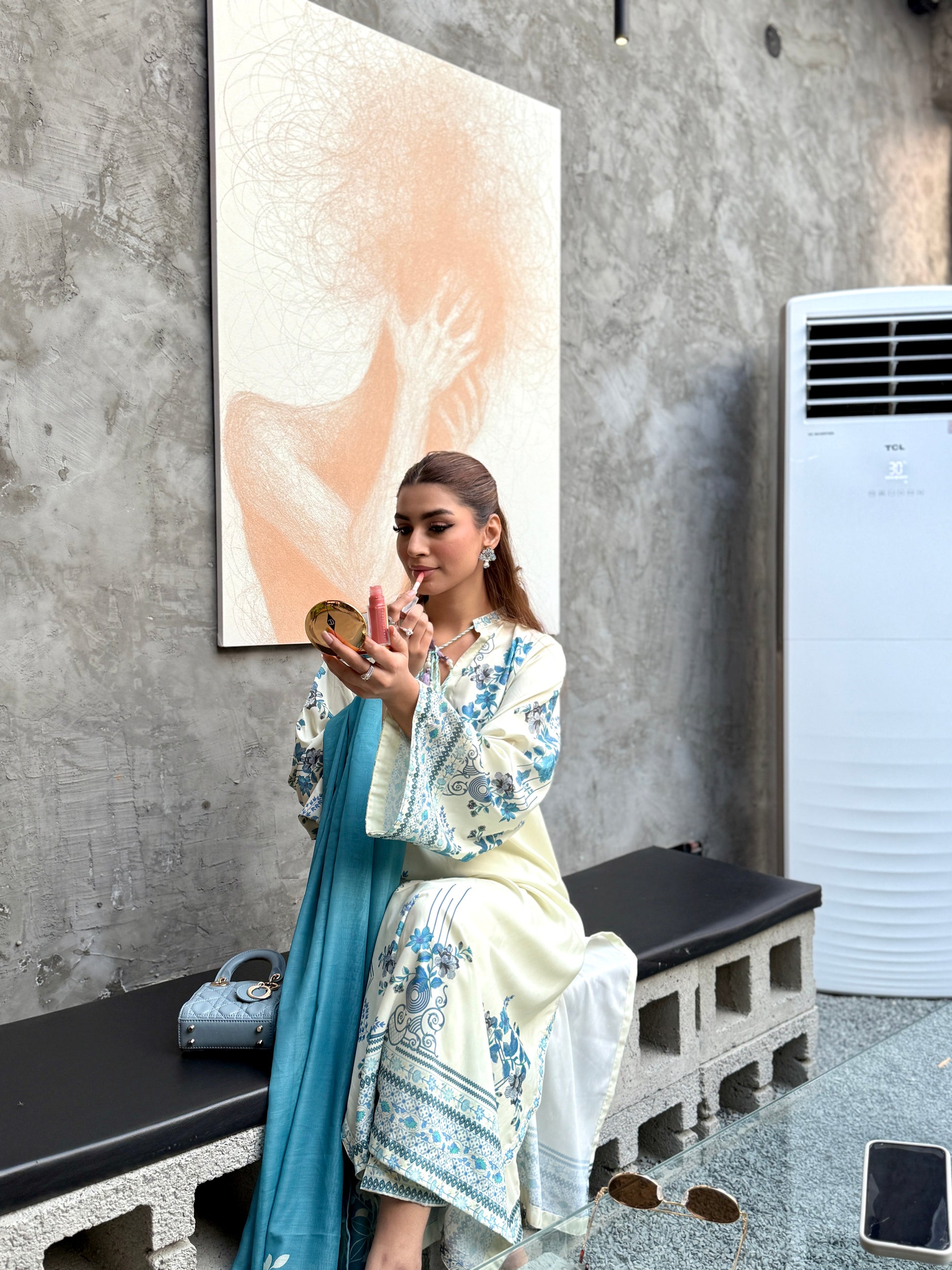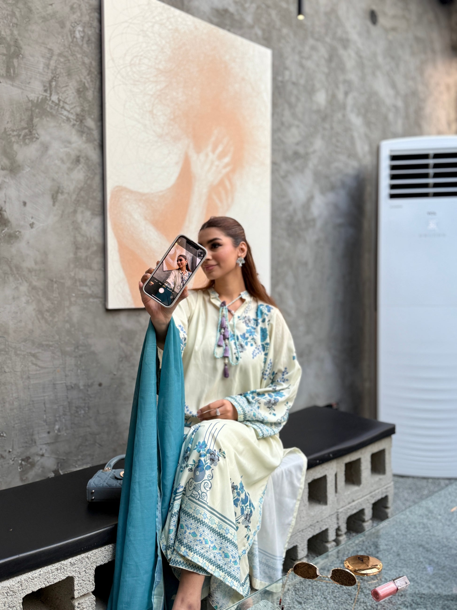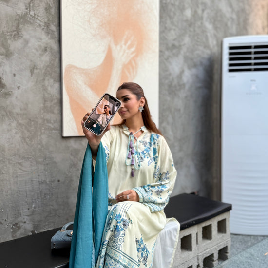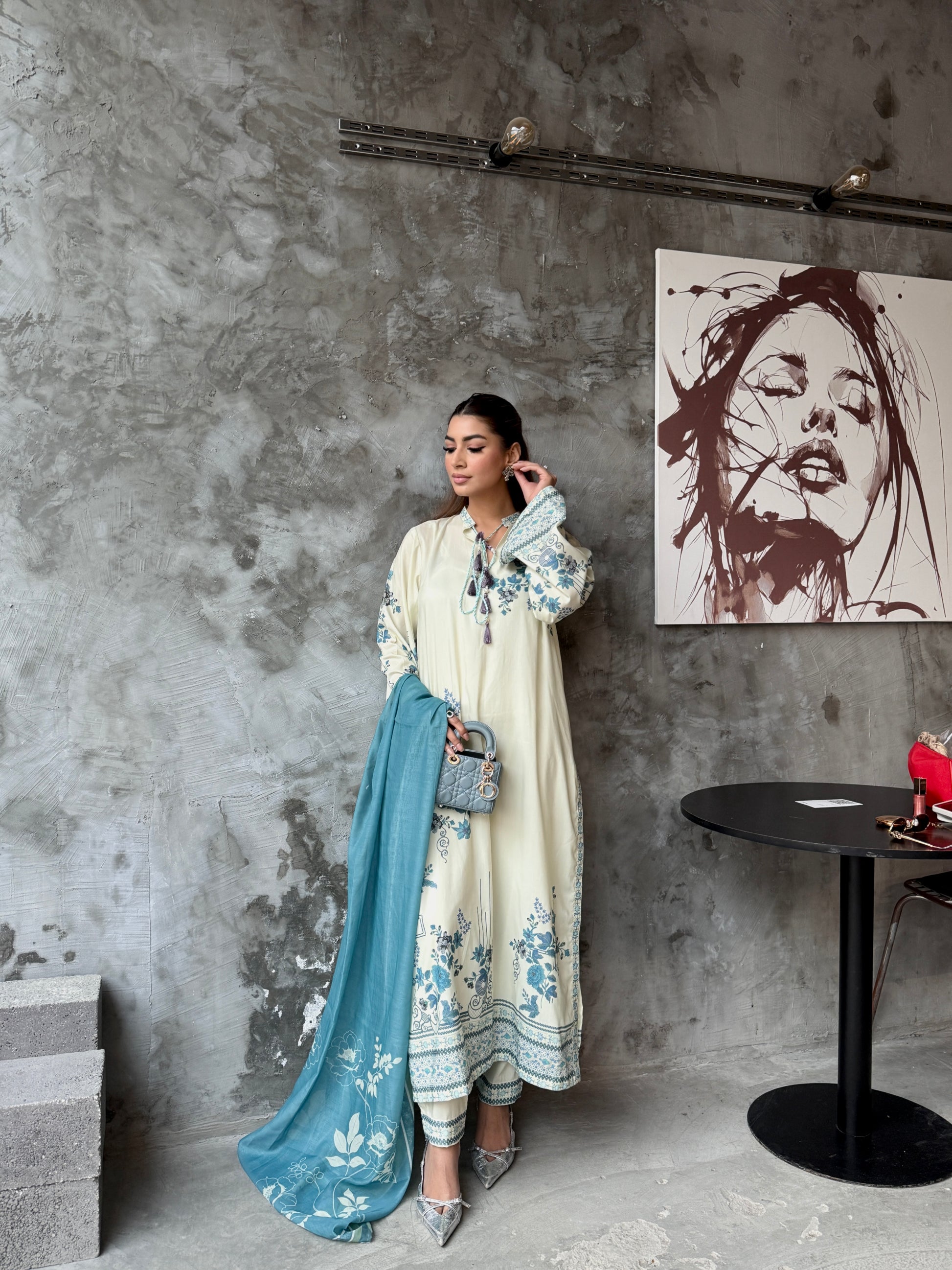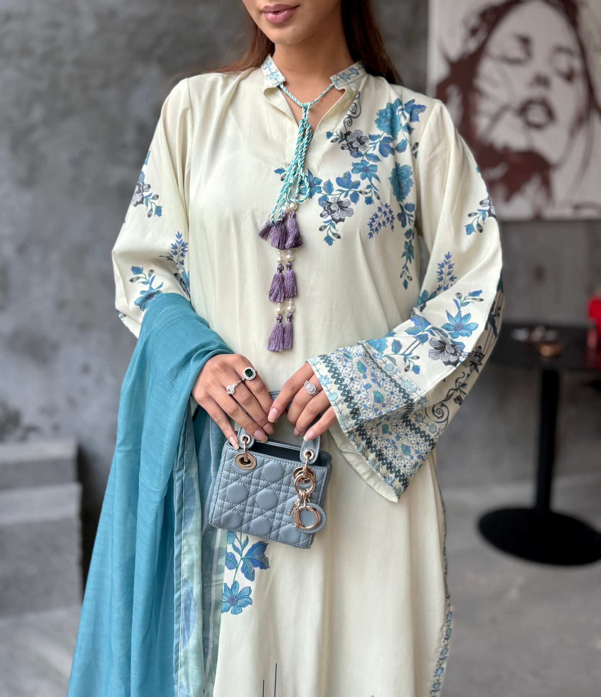 Elegant cream and blue ensemble with collared tassels neckline, flowy shirt, and straight trouser. Paired with a blue-green dupatta featuring botanical print. Perfect for Eid or Iftari gatherings.
